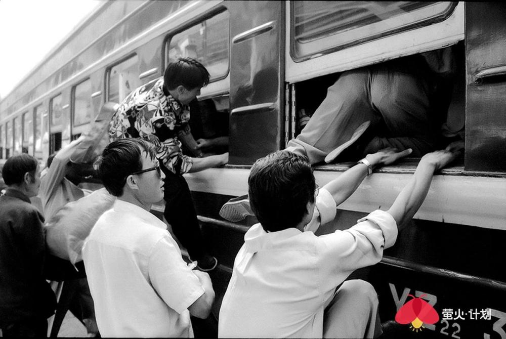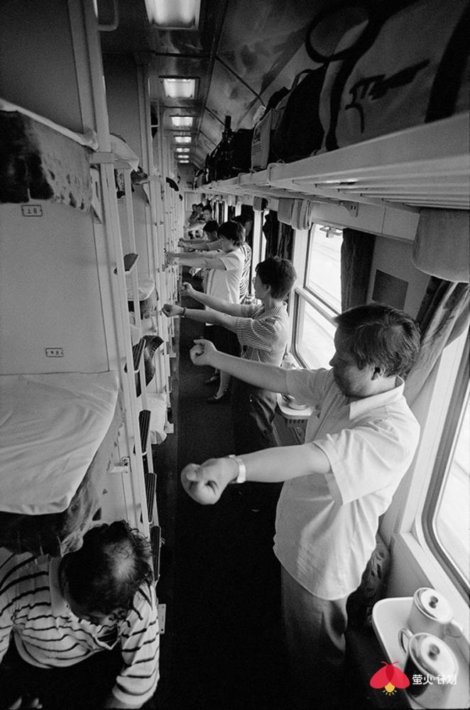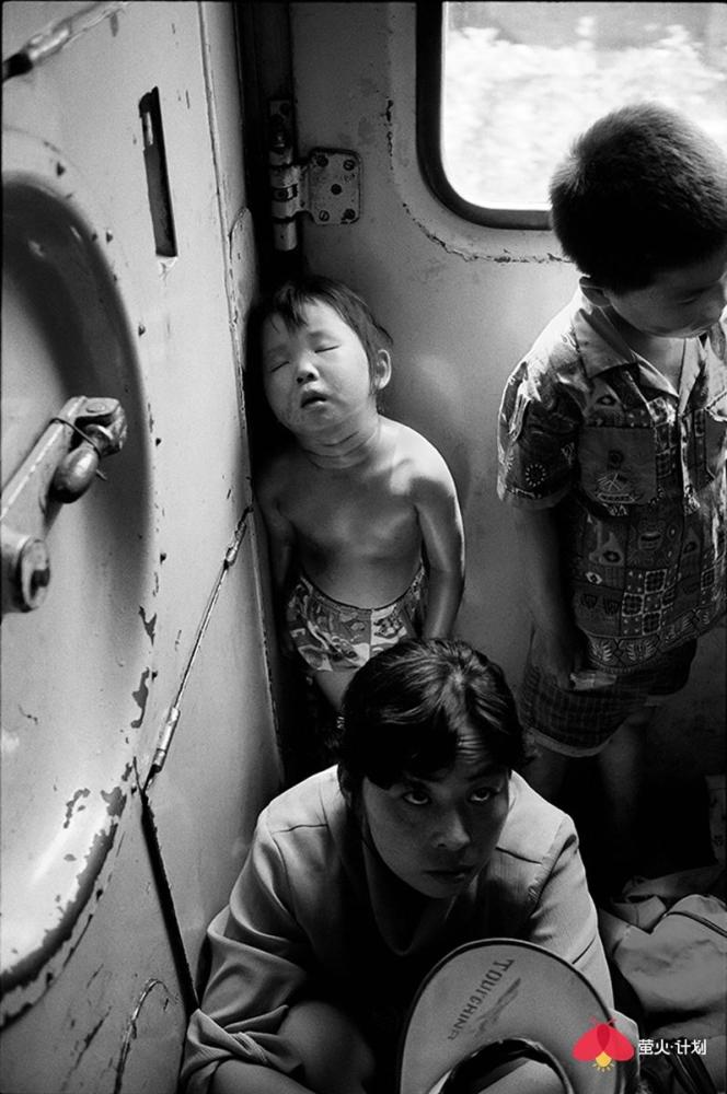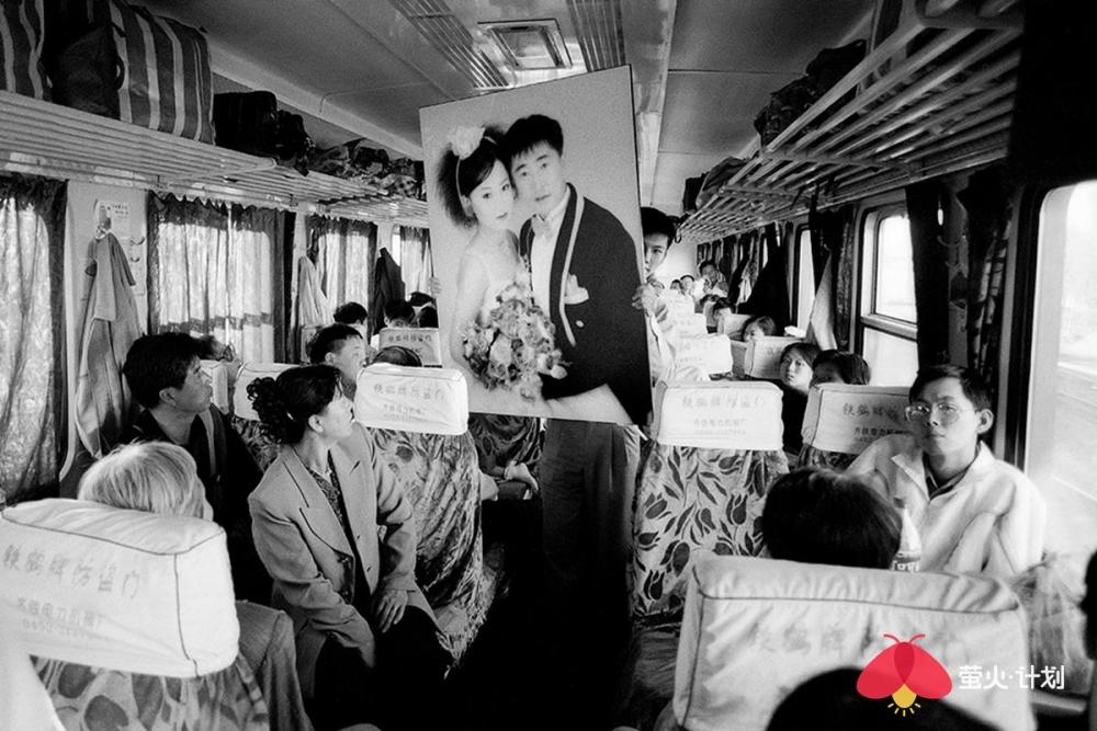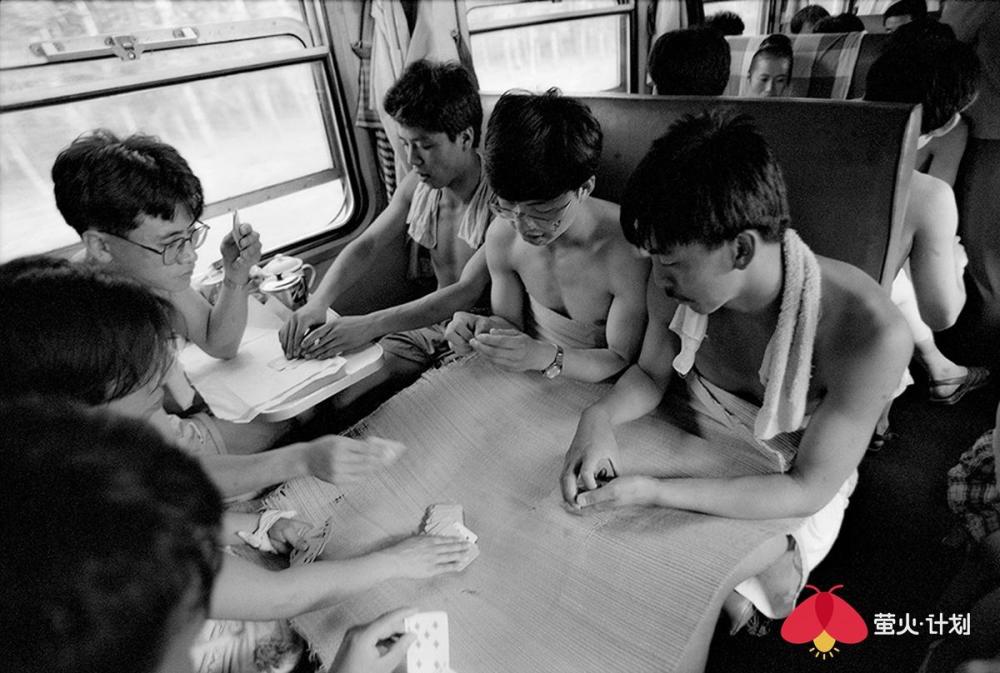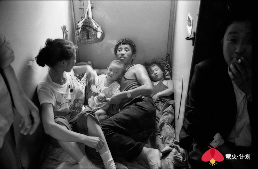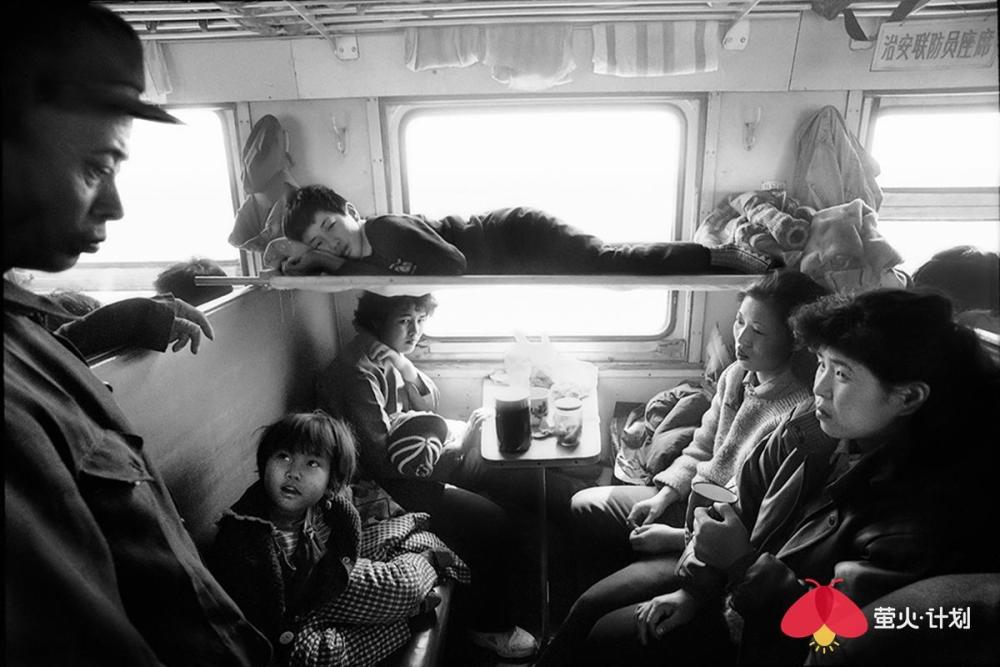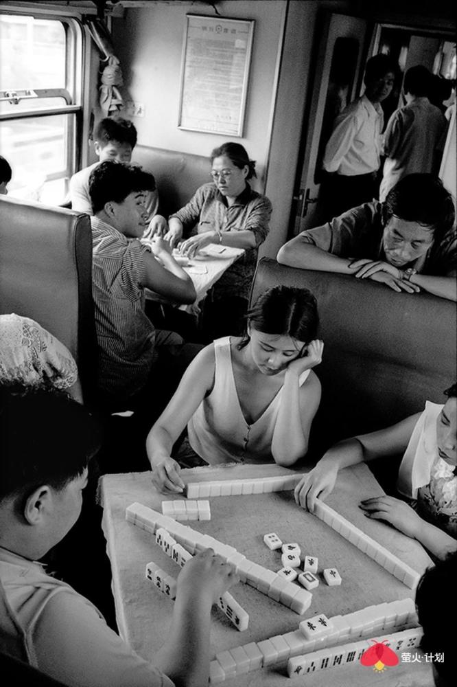 以下是王福春讲述的故事: 我是苦孩子出身,三岁没妈五岁没爹,是哥哥嫂子将我抚养长大,还供我读书上学。没有他们,就没有我的今天。而我对铁路的感情也来源于我哥哥。哥哥是铁路工人,家住在铁路机务段附近,我从小看火车跑、听火车叫,甚至抓火车、跳火车。这也为后来的拍摄播下了种子。 我一生都在干我最喜欢的事情,前半生搞美术,后半生玩摄影。 我的选题就是生在哪里拍哪里,职业是什么拍什么。我是黑土地人,我就拍了《黑土地》、《东北人》、《东北人家》三部曲。我是铁路职工,我就拍铁路机车,把机车一直拍到退役,退出大众视线。我还把火车车厢里的人拍了40年,从绿皮车拍到白皮车,拍下了中国改革开放的历史变化。 在车里,我什么都遇到了 火车上的中国人,40年来的精神状态、服装打扮、休闲方式等都发生了极大改变。 火车是个流动社会,是中国人的临时大家庭。那时,中国人出行首选坐火车。八九十年代,民工潮出现,农民工从农村涌入城市,一下把车厢给灌满了,整个火车被压得快喘不过气了。人满为患,一票难求,买票得排两三天队。 过去坐绿皮火车,人的感情也很丰富。几个陌生人坐在一起唠嗑,一会就成为好朋友。而现在在高铁上,邻座间没有一点交流,每个人都在低头看手机,非常冷漠。 1994年,从北京到沈阳的火车上,有一个在湖南做生意的沈阳小伙,他对象长得很漂亮,是个模特,这在当时是比较特别的职业。1998年,我在火车上遇到了一对从齐齐哈尔到哈尔滨拍婚纱照的新人。那时候婚纱照刚刚兴起,只有大城市有。 我也看到了令人心酸的场景。在去往南宁的一趟火车上,我遇到了一个民工的孩子,五六岁的小女孩满身汗,倚在门头站着就睡着了。因为没法给她提供帮助,我心里有种自责和难受,站了五六分钟,就是按不下快门,后来无奈按下快门,我反而被快门声刺痛,想起自己的童年——我是苦孩子,从小没爹没妈。“摄影师必须有良知和爱心。” 这是没有座位的一家四口,他们挤在一平方米的车门附近,车内没有空调,高温中的他们满脸是笑。 长途旅行,最痛苦的就是打发时间。夫妻俩会靠按摩消遣时间,更多人喜欢打牌。1994年,从北京到沈阳的火车车厢内同时支了好几桌麻将,原来这是列车为增加收入将麻将出租给乘客。1999年,在一趟从北京到乌鲁木齐的列车上,广播体操的音乐一响起来,所有人都放下手里的事情,站起来跟着音乐做广播体操。 不过,也总能碰上赶时髦的有钱人。他们往往穿着西装烫着头,身上别个大哥大,用戴着昂贵手表的手点燃名牌香烟,在车厢里吞云吐雾。那时候,大家自带收录机,伴随邓丽君的天籁之音,慢悠悠地结束旅程。