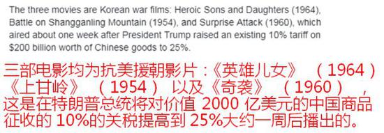 文章进一步指出,促使作为中国官方媒体风向标的电影频道做出如此安排的,恰是当前中美关系的复杂局势。 “中美贸易摩擦之际,中国电视台突然之间开始播放‘反美’电影。”昨天(5月20日)下午的一篇报道中,澳大利亚广播电视网直接以大标题猜测电影频道“反常”背后的原因。 澳媒这样细数电影频道几天来的播放列表:《英雄儿女》(1964)、《上甘岭》(1954)、《奇袭》(1960)……过去3天里,这些拍摄于抗美援朝战争期间的影片,均于晚上8点15分替代原有播放节目出现在电影频道的荧幕上。 “尽管不排除电影频道想让观众重温中国战争电影的可能性,但专家们指出了这种突然变化背后更明显的关联:在与美国的贸易战持续很长时间的情况下,所有这些电影都有公开的‘反美’情节。”报道说。 同样让外媒注意到的,还有中国的社交网络上对电影频道这一做法的空前支持。 例如澳大利亚广播电视网就特别援引一名中国微博用户的话写道:“我们应该播放所有关于抗美援朝战争的老电影。” 而与此同时,这些影片的集体亮相也无疑让一些外国网友对当年的那场战争有了更多了解。 有外国网友甚至在评论中特别点明,抗美援朝题材的这些电影是在特朗普宣布对中国商品加征关税之后一周左右播出的。