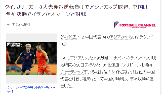 《GOAL》日文版用《里皮魔法显灵 中国逆转取胜晋级8强 泰国差一步不及》为标题报道说—— 中国下半场的阵容改变显示出了效果。 20日,在2019年亚洲杯淘汰赛的第一回合比赛中,从A组和C组分别以第二名的身份出线的泰国和中国进行了对阵。泰国首发派出了颂克拉辛、特拉西尔-当达和提拉通三名在J联赛得到锻炼的球员先发。 比赛一开始,在身体上更为强壮的中国队采用长传前进,对泰国施加了压力。泰国以有韧性的防守和快速反击创造机会。31分,凭借角球破坏后的球,泰国的素巴猜接直转身射门中的,泰国获得了贵重的领先。 1球落后的中国队在下半时更换了阵容,里皮主帅使用了3后卫,更加明确了队员们的职责。在一对一上占据优势的中国逐渐掌控比赛,多次创造了接近球门的机会,泰国凭借门将西瓦拉的好防守没能让中国破门。 但是换上场的中国前锋肖智改变了结果。他利用自己的身高头球攻门,被门将一度阻挡后,又自己打入,帮助中国扳平比分。 第71分钟,凭借配合穿过了3人防守的郜林诱使对手犯规,获得了PK,郜林自己主罚,中国逆转成功。 最终时间段,泰国也曾经接近中国球门,但是射门缺乏精度,未能打进第二个球。门将颜骏凌的超级防守也帮助中国顶住了1球优势,晋级下一轮。 《FOOTBALL CHANNEL》以《泰国3名J联赛球员首发遭逆转 亚洲杯被淘汰 中国晋级下一轮对阵伊朗和阿曼的胜者》