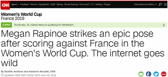 CNN:梅根•拉皮诺在女足世界杯对阵法国队时,摆出了一个史诗般的姿势。互联网为之疯狂。 就是下面这张照片↓