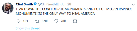 克林特•史密斯:“拆除邦联纪念碑,建造梅根•拉皮诺纪念碑,这是治愈美国的唯一途径。” 不过,CNN在报道中也提到,但是其他人,包括美国总统特朗普在内,认为拉皮诺在世界杯期间的庆祝表现是傲慢的,有些为时过早。 在6月25日足球杂志《Eight by Eight》公布在推特中的一段视频显示:当被问到“如果球队赢得女足世界杯,她是否会兴奋地去白宫”时,拉皮诺说,“我不会去**的(F开头的脏字)白宫的。”她还补充说,“不,我不会去白宫的。我们不会被邀请,我对(我们会被邀请)深表怀疑。”值得注意的是,CNN说,拉皮诺爆粗口的采访发生在今年1月,但这段采访视频却是在最近才被公布。