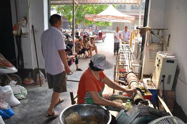 初夏六月,在河南许昌禹州市鸿畅镇柏桥村,一位村民正在晾晒刚刚做出来的美食,这种像绳子一样的美食,在这里叫面皮,是一种很受当地人欢迎的消夏食品。做出来的面皮晾干可以储存,吃的时候简单泡发、调味,就能做成一碗可口美味的凉面皮。 正在开机器的这位师傅叫张清华,今年60岁,做这门生意已经有二十多年了,他手里这台机器冬天可以做人造肉、人造鸡翅等,夏天则可以做这种面皮,一般做面皮从三四月份开始,到七八月份结束。 大家通常在小吃店里吃的擀面皮,是用面粉洗出来的淀粉做的,中间还要经过蒸制的环节,而张师傅做的这种面皮,看起来比较简单,从和面到出面皮,就像老家压面条一样。 据张师傅介绍,做这种面皮需要三种配料,十斤的面粉加三四两红薯淀粉,然后还有二两植物油,油的作用主要是让做成的面皮光滑不起泡,红薯淀粉则能让面皮吃起来更筋道一些。每天来做面皮的人很多,大家都拿袋子排队,袋子里装的面粉少则十几斤,多则几十斤。 和面在搅拌机里进行,每家的面都单独和,然后端到这台机器的进料口,填料的时候分成小面团往机器里填,填进去的面团经过电加热装置和挤压装置,出来就是长长的面皮。 在机器的出料口是一个滑轮,滑轮的后面是一个长长的架子,刚出来的面皮温度很高,经过架子的冷却以后方便用手盘起来。张师傅和妻子每天早上七点趁凉快开始营业,到下午三四点钟关机器,一天能做个三四百斤面。 张师傅这里不管是冬天的人造肉还是夏天的面皮,都做的不错,所以方圆一二十里地的乡亲们都来他这里做。面皮的加工费是一块钱一斤,如果不算原料的成本,大概花上十几块钱就能吃一夏天的凉皮,可以说相当实惠。 做好的面皮当时就可以吃,菜园里的黄瓜切一根,再放入盐、香油蒜汁、生抽、辣椒酱搅拌,一碗好吃的自制凉皮就可以开吃了。 每天来张师傅这里做凉皮的人很多,碰上饭点的时候,总有热心的乡亲把刚做出来的面皮拿出来一把,然后用张师傅的盆子和调料调一下,解解大人小孩儿的馋。 作为一种乡土美食,面皮简单易做,关键是耐储存,还可以邮寄。很多乡亲们一做就是几十斤,他们说不光是自己吃,还要给在外的家人或者亲戚朋友们寄点,因为这个面皮在外面还真的买不到。摄影记录|张根栋(图文乡土河南原创,剽窃必究)