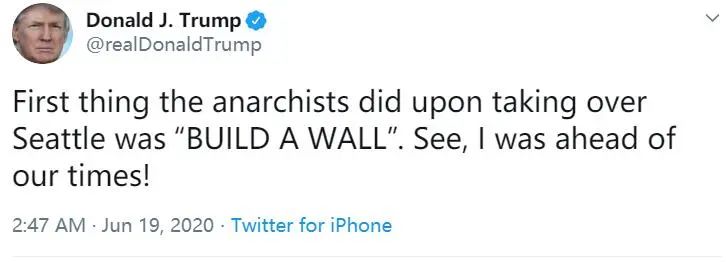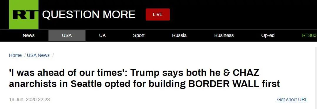 RT:“我走在时代前列”:特朗普说他和“西雅图自治区”无政府主义者都先建了边境墙 特朗普在推特上称,“无政府主义者占领西雅图后做的第一件事就是‘建墙’。看,我走在了时代的前列!”