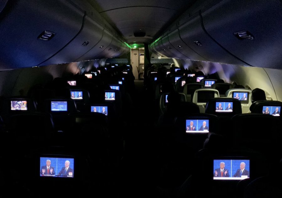 双方对疫情给出不同判断 这场辩论持续约90分钟。辩论涉及话题包括新冠疫情、国家安全、医保、移民、种族、经济、气候变化等,都称得上眼下美国最关注、最“撕裂”的热点话题。 “如何领导美国抗疫”是主持人提出的第一个问题。特朗普和拜登对美国疫情前景的判断截然相反。 特朗普称,美国疫情“正在转弯,就要消退”,还称疫苗将很快问世。他没有阐述自己下一阶段抗疫计划,只强调应开放经济、让学校复课,指责拜登主张“锁国”。 拜登则援引美国疫情最新数据,称美国“将要进入一个黑暗的冬天”。他大力批评特朗普领导抗疫不力,指责特朗普一直散布不实信息。拜登然后讲述他的抗疫计划,包括鼓励人们戴口罩、加强快速检测、制定重启经济和校园的全国性标准等。 颇为讽刺的是,双方倒是在一件事上颇为“一致”,就是在辩论中着力抨击对方“腐败”,同时否认针对自己的腐败指控。 拜登坚称自己担任副总统期间,他本人和儿子亨特均未从中渔利。特朗普则否认自己纳税额过低,称他实际上预缴了高额税款。 观众评出的赢家,竟然是…… 10月22日晚间美国底特律飞往华盛顿一架航班上,许多乘客观看辩论直播。图片来自网络 作为新引入的规则,这场辩论在个人陈述环节关闭非发言者的话筒,在自由辩论阶段才同时打开双方话筒。这是为了避免特朗普和拜登首次辩论时相互插话、打断的混乱局面重演。有美国媒体评价说,随意打断少了、人身攻击少了,两人辩论总算“正常”点了。 辩后,双方团队都称自己胜利,并引用各色民调佐证。特朗普竞选团队在一份声明中说,特朗普揭露了拜登作为华盛顿政客光说不做的面目。拜登竞选团队则表示,拜登证明了自己拥有能带领美国克服多重危机、实现团结的判断力、经验和性情。 不过,在社交媒体上,网友却选出了“赢家”——当天辩论主持人、全国广播公司白宫记者克丽斯滕· 韦尔克。上一场辩论全程很无奈的主持人华莱士甚至还说,对韦尔克的表现“羡慕嫉妒恨”。