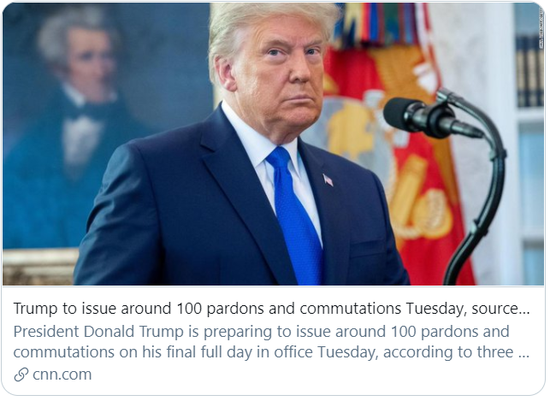 原标题:白宫生活进入倒计时,特朗普还想“搞事情”? 距离美国当选总统拜登正式入主白宫还有2天,这意味着特朗普的白宫生活已经进入倒计时阶段。不过,很明显特朗普想把握住作为总统的最后机会,接着“搞事情”。 据《每日邮报》报道,特朗普想在拜登就职典礼当天早上离开白宫,他还希望在离开华盛顿特区时能举行一个“军队风格”告别仪式,并被大群的支持者簇拥。不过,该要求已经被五角大楼拒绝。两名高级国防官员告诉《防卫一号》新闻网站,没有计划对特朗普进行军事告别。 除了想要一个“华丽的告别”,特朗普还打算在执政尾声,利用好手中最后的权力。当地时间1月17日,据美国有线电视新闻网(CNN)报道,三名知情人士透露,特朗普准备在当地时间1月19日发布约100项赦免和减刑命令。 特朗普将赦免白领罪犯和说唱歌手 根据美国宪法第二条第二款,美国总统有权对危害美利坚合众国的犯罪行为执行缓刑以及赦免,但总统不能赦免弹劾。值得注意的是,赦免权只能用于联邦犯罪层面,并不能限制州与地方层面的起诉,赦免权也不能使此人在今后的犯罪中免于起诉。 当地时间1月13日,特朗普成为美国历史上首次遭到两次弹劾的总统。密歇根州立大学法学教授Brian Kalt指出,尽管特朗普仍处于被弹劾状态,但他依然有权力发布赦免命令。此举也有先例,前总统比尔·克林顿于1998年12月19日被弹劾,1999年2月12日被宣告无罪,在这期间他仍赦免了34人。 据CNN报道,知情人士指出,当地时间1月17日,白宫专门举行了一次会议以确定最终赦免名单。此次重大宽赦行动对象主要包括白领罪犯、知名说唱歌手等,截至目前还不包括特朗普本人。据《纽约时报》报道,知情人士透露,此前特朗普曾多次与顾问讨论,能否提前赦免自己以及家人。 知情官员指出,特朗普在圣诞节前就开始推出赦免和减刑措施,随后,特朗普一直专注在选举人团票的认证程序上,紧接着国会大厦又发生了暴乱,这才导致宽赦进程一度中止。官员认为,除非特朗普打算在最后一刻赦免有争议的盟友、家人甚至他自己,否则这份名单将成为最后一份赦免名单。目前关于总统能否赦免自己,在法理上仍存在较大争议。 特朗普将于当地时间1月19日发布约100项赦免和减刑命令。/CNN报道截图