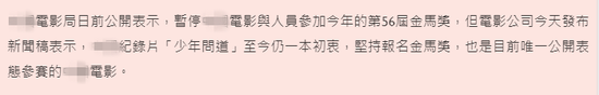 众所周知,去年金马奖期间,台湾导演傅榆公开发表支持“台独”言论,遭到在场大陆艺人与社交媒体上网民的自发抵制,事件引爆两岸舆论,大量网民对这种在电影艺术场合夹带政治“私货”的行为展开声讨。