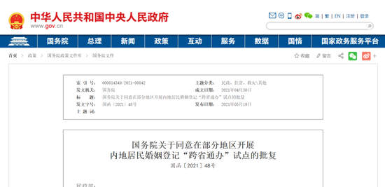 现行《婚姻登记条例》规定,居民结婚、离婚登记都要到男女双方之一的户籍所在地进行办理。这一要求,在当前“流动中国”的大背景下,已与现实愈发脱节。 如最新公布的人口普查数据显示,2020年,我国有4.93亿人处于“人户分离”的状态,这其中就有相当比例的适婚人群。而据民政部数据,当前全国婚姻登记机关平均每年办理结婚登记1000万对左右、离婚登记近400万对、补领婚姻登记证400万对左右,直接服务近4000万人次。也就是说,必须回户籍地才能进行婚姻登记,影响到亿万人的切身便利,由此令婚姻登记所消耗的不必要的社会成本,不容小视。 此番试点落地,时机已完全成熟。如婚姻登记信息管理系统目前已实现全国联网。而过去几年,一些地方也分别试点了市域内通办与省内通办,为跨区域服务办理积累了相当经验。在此基础上,通过进一步试点跨省通办,最终过渡到全国“一盘棋”,相信只是时间问题。