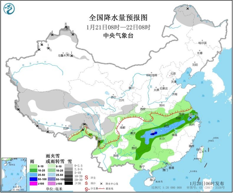 据中央气象台网站1月20日8时消息,20日,苏皖以及长三角等地霾天气维持。21日至23日白天,华北中南部、黄淮、汾渭平原等地静稳形势再次建立,将有中度霾,河北南部、河南北部、山东北部有重度霾。预计21日至25日,江淮、江南大部、贵州东部和南部及华南等地将先后将出现中到大雨,局地暴雨。 今晨鲁苏皖等地有大雾天气 今晨,山东西南部、江苏中北部、安徽北部和南部、上海、浙江西部、湖北东南部、江西中北部及贵州西南部等地的部分地区出现能见度不足1000米的大雾,局地能见度不足200米。 昨日,吉林中东部、黑龙江东部、青海南部、川西高原北部、西藏东部等地的部分地区出现小雪;新疆伽师县过去24小时无降水,6时气温-9℃。 黄淮江淮等地有大雾和霾 20日,苏皖以及长三角等地霾天气维持。21日至23日白天,华北中南部、黄淮、汾渭平原等地静稳形势再次建立,将有中度霾,河北南部、河南北部、山东北部有重度霾。 此外,预计20日早晨至上午,山东中西部和南部、江苏、安徽东部、湖北中东部等地有大雾,其中,山东西部和南部、江苏北部等地的部分地区有能见度不足200米的强浓雾,局地能见度不足50米,中央气象台1月20日06时继续发布大雾黄色预警。 江淮江南华南等地将出现较强降雨 预计21日至25日,江淮、江南大部、贵州东部和南部及华南等地将先后将出现中到大雨,局地暴雨,上述地区累计降水量40~80毫米,局地可达100毫米以上。 未来三天具体预报 1月20日08时至21日08时,吉林东部、新疆北部、西藏南部和东部、青海东部、西北地区东南部、川西高原、云南西北部等地的部分地区有小到中雪或雨夹雪,其中,西藏东部有大雪(5~8毫米)。西藏东南部、陕西南部、黄淮西部、江汉、江南西部、西南地区东部、华南西部等地的部分地区有小到中雨,其中,西藏东南部、云南西北部等地的部分地区有大雨(25~35毫米)。内蒙古西北部、西藏北部等地的部分地区有4~5级及以上风(见图2)。 图2 全国降水量预报图(1月20日08时-21日08时) 1月21日08时至22日08时,内蒙古东北部、黑龙江西北部、新疆北疆北部、西藏大部、青海南部、西北地区东南部、川西高原、云南西北部等地的部分地区有小到中雪或雨夹雪,其中,新疆阿勒泰山区、西藏东部和西部等地的部分地区有大雪(5~9毫米)。江淮南部、江汉东部和南部、江南北部、贵州东部、广西北部等地的部分地区有中到大雨,其中,湖南北部局地有暴雨(50~55毫米)(见图3)。 图3 全国降水量预报图(1月21日08时-22日08时) 1月22日08时至23日08时,内蒙古东北部、黑龙江西北部和东南部、吉林东部、新疆北部和西部山区、西藏北部和东部、青海南部、甘肃南部、四川西部和南部、云南北部等地的部分地区有小到中雪或雨夹雪,其中,新疆阿勒泰山区、西藏东部等地的部分地区有大雪(5~9毫米)。江淮南部、江南西部和北部、贵州中东部等地的部分地区有中到大雨,其中,湖南西部、贵州东北部等地的部分地区有暴雨(50~65毫米) 图4 全国降水量预报图(1月22日08时-23日08时)