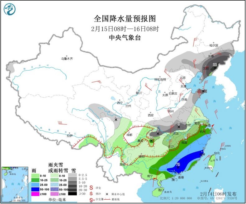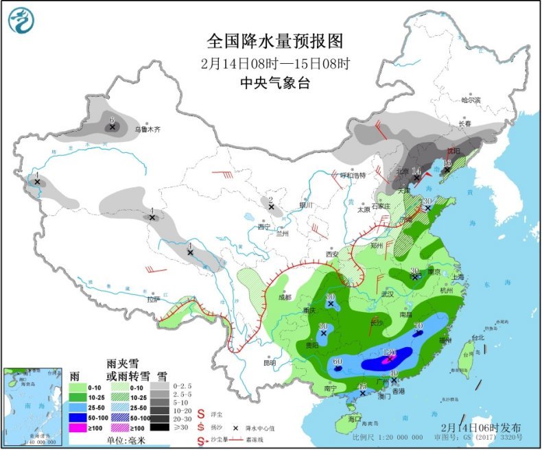 中国天气网讯 今天(14日),寒潮继续肆虐我国中东部地区,制造大范围雨雪和大幅度降温,局地降雪达暴雪量级,降温超10℃,中央气象台也是寒潮、暴雪等预警齐发。建议公众及时增减衣物,尽量减少外出,谨防感冒。 昨天夜间开始,寒潮影响西北地区东部、华北和东北地区,并逐渐南下。实况监测显示,在强冷空气的影响下,昨天黑龙江、内蒙古中部、新疆伊犁河谷出现小到中雪,内蒙古中部偏北地区局地大雪。 今明两天,我国中东部将继续出现大范围雨雪。中央气象台预计,今天,新疆伊犁河谷、青海南部、川西高原、华北中东部、黄淮中北部、湖北西北部等地的部分地区有小到中雪或雨夹雪,其中,内蒙古东南部、河北东部、北京东部、天津、辽宁东部和西南部、山东北部等地的部分地区有大雪或暴雪(10~16毫米);西南地区东部、湖北西南部、黄淮南部、江淮、江南西部和南部、华南大部等地的部分地区有中到大雨,其中广东北部、江西南部等地的部分地区有暴雨,局地大暴雨(100~120毫米)。 明天,华北北部、东北地区中东部和南部、黄淮东部和南部、江淮大部、江汉大部、江南北部和西部、西南地区北部和东部等地的部分地区有小到中雪或雨夹雪,其中,吉林东部、辽宁中东部、山东半岛、江淮西部、江汉南部等地的部分地区有大雪或暴雪,局地大暴雪(20~22毫米);江南大部、华南中东部等地的部分地区有中到大雨,其中,江西南部、福建中南部、广东中东部等地的部分地区有暴雨(50~75毫米)。 气象专家提醒,此次雨雪覆盖范围广、强度大,且华北、黄淮、江淮、江汉等多地存在雨雪相态转换过程,公众需加强防范雨雪天气可能导致的道路湿滑、积雪结冰和低能见度天气等对出行交通、生活生产等的不利影响,并密切关注最新天气预报和预警信息。 除了降雪,今后三天强冷空气仍将在中东部制造剧烈降温。中央气象台预计,14日至16日,我国中东部大部地区将先后降温8~10℃,其中东北地区东部、华北北部和东南部、黄淮中东部、江汉东部、江淮大部、江南中东部和南部、华南中北部等地的部分地区降温可达12~16℃。14日起最低温度0℃线将从华北地区逐步南移,2月17日最低温度0℃线将南压到江南南部。 伴随降温出现的还有呼啸的北风,今后三天长江中下游及以北地区将先后出现4~6级偏北风;东部和南部海区有6~8级、阵风9级的大风。降温伴随着寒风,风寒效应下体感会更加的寒冷。 气象专家提醒,近日来中东部地区升温明显,寒潮过境期间降温幅度剧烈,请公众做好防寒保暖措施,尤其注意防范强降温可能引发的感冒,同时尽量减少外出,并保持良好的饮食习惯。