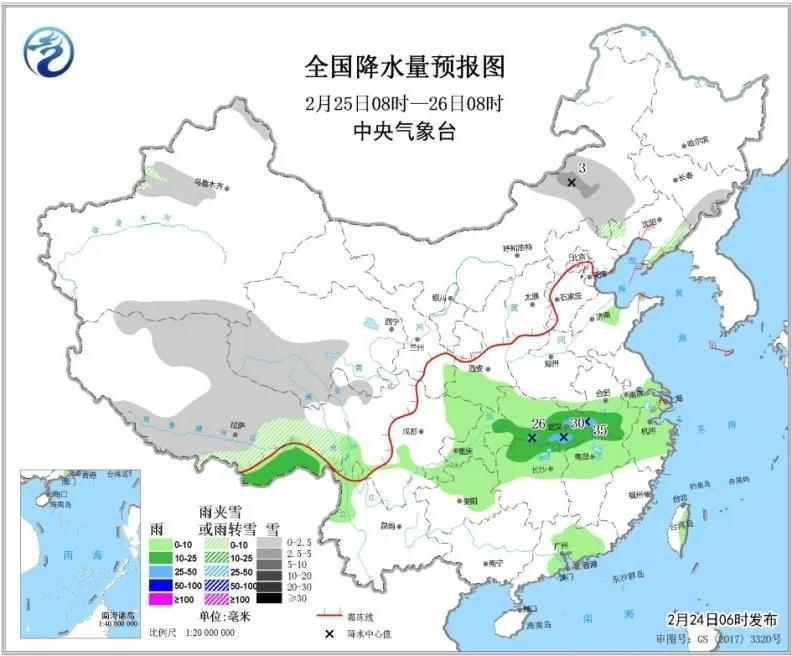 2月24日,澎湃新闻从中国气象局获悉,2月24-25日,受到一股弱冷空气影响,新一轮降水过程即将铺开,全国降水的区域将有所扩展,中东部多地降雨增多,黄淮、江淮等地雨势较大。 不过,这波降水只是打头阵,2月26至29日,中东部还将有一次明显雨雪天气过程。 在冷空气和降水的影响下,多地降温前后温差明显,如杭州、南京、武汉等地,26日最高气温相比今天,降温幅度可达6~10℃。 具体影响来看,2月24-25日,青藏高原中东部、川西高原北部及新疆北部、内蒙古东部、河北北部等地有小到中雪或雨夹雪;华北、黄淮、江汉、江淮、江南北部等地有降水过程,其中山东半岛、江苏北部、安徽北部和西南部、湖北、湖南北部等地有中雨、局地大雨。 预计2月26至28日,中东部地区还将有一次明显雨雪天气过程,其中西北地区东部、华北、东北、黄淮北部等地部分地区有小到中雪或雨夹雪、局地大雪;黄淮南部、江汉、江淮、江南、华南西部及西南地区东部等地的部分地区有中到大雨、局地暴雨。 气象专家提醒,未来几天,公众需注意防范雨雪天气对交通出行的不利影响。正值“疫”情防控时期,多地降温明显,还需注意保暖防寒,谨防感冒。 另外,预计2月24日夜间至25日早晨、25日夜间至26日早晨,河北南部、河南北部、山东西部、浙江北部和东部、福建东部、广东西部、广西东部等地部分地区有大雾,需注意防范大雾对出行的影响。