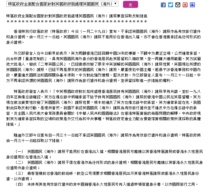 【环球网报道 记者 丁洁芸】英国政府宣布自1月31日起,调整后的英国国民(海外)(BNO)护照及签证政策正式生效。对此,港府刚刚发布新闻公报表示,香港特别行政区政府(特区政府)今日(1月29日)宣布,不承认英国国民(海外)护照作为有效旅行证件和身分证明,由1月31日起,英国国民(海外)护照不能用于在香港出入境,亦不会在香港获承认为任何形式的身分证明。 在29日举行的外交部例行记者会上,发言人赵立坚在回应中称,英方罔顾香港已经回归中国24年的事实,不顾中方严正立场,公然违背承诺,执意炮制出台所谓“量身定制”的具有英国国民(海外)(BNO)身份的香港居民和入籍政策,并一再扩大适用范围,试图把大批港人变成二等英国“公民”,已经彻底改变了原来中英谅解的BNO性质。赵立坚表示,英国现在所谓的BNO已经不再是原来的BNO,此举严重侵犯中国主权,粗暴干涉香港事务和中国内政,严重违反国际法和国际关系基本准则。中方对此强烈愤慨,坚决反对。“自1月31日起,中方不再承认所谓的BNO护照作为旅行证件和身份证明,并保留采取进一步措施的权利。”赵立坚称。 以下是港府新闻公报全文: 香港特别行政区政府(特区政府)今日(一月二十九日)宣布,不承认英国国民(海外)护照作为有效旅行证件和身分证明,由一月三十一日起,英国国民(海外)护照不能用于在香港出入境,亦不会在香港获承认为任何形式的身分证明。 外交部发言人在今日较早前表示,英方罔顾香港已经回归中国24年的事实,不顾中方严正立场,公然违背承诺,出台所谓「量身定制的」、具有英国国民海外身分的香港居民赴英居留和入籍政策,并一再扩大适用范围。英方试图把大批港人,变成「二等英国公民」,已经彻底改变了原来中英谅解的英国国民(海外)护照性质,英国现在所谓的英国国民(海外)护照,已经不再是原来的英国国民(海外)护照,严重侵犯中国主权,粗暴干涉香港事务和中国内政,严重违反国际法和国际关係基本准则,中方对此强烈愤慨、坚决反对。外交部发言人宣布,一月三十一日起,中方不再承认所谓的英国国民(海外)护照作为旅行证件和身分证明,并保留採取进一步措施的权利。 特区政府发言人表示:「中英两国政府对于如何处理香港居民持有英国国民(海外)护照早有共识,并于一九八四年互换备忘录确认。英方在备忘录中明确承诺不给予持有英国国民(海外)护照的香港中国公民在英居留权。英方现在做法实质性改变了英国国民(海外)护照性质,根本地违反了英方在备忘录中的承诺。英方违背承诺在先,我国对此採取反制行动,是理所当然。我国不承认英国国民(海外)护照为有效旅行证件并不违反中方在备忘录中的承诺,及全国人民代表大会常务委员会关于《中华人民共和国国籍法》在香港特区实施的几个问题的解释。中央政府现对英方违背承诺採取的立场和政策是外交行为和中央事权,特区政府定会全力配合贯彻落实相关政策所须採取的具体措施。」 随着外交部今日宣布自一月三十一日起不承认英国国民(海外)护照作为有效旅行证件和身分证明,特区政府将由一月三十一日起採取以下措施: (一) 英国国民(海外)护照不能用于在香港出入境,相关香港居民可继续以其香港特区护照或香港永久性居民身份证用于在香港出入境; (二) 英国国民(海外)护照不得在香港作为任何形式的身分证明,相关香港居民可继续以其香港永久性居民身份证用作身分证明; (三) 乘客登机前往香港的航班时,航空公司须要求相关香港居民出示其香港特区护照或香港永久性居民身份证,以作证明; (四) 未持有其他有效旅行证件的非中国籍香港永久性居民可向入境处申领签证身分书,以作国际旅行之用。 自一九九七年七月一日起,香港特区政府在中央政府的授权下,向中国籍香港永久性居民签发香港特区护照。截至二○二○年十二月,入境处已签发并仍在有效期内的香港特区护照近580万本。现时,香港特区护照持有人可享免签证前往167个国家或地区的待遇,特区政府会继续致力争取更多国家或地区给予香港特区护照持有人免签证的待遇,便利需要出行的香港居民。 发言人严正指出:「英国政府此次举措明显是利用部分港人仍持有英国国民(海外)护照或身分作政治炒作,藉口为有关港人在英居留和入籍提供新路径。其伪善态度亦可见于英国政府在回归前一段颇长时间透过改变法律或政策无意给予港人居英权,而自英国国民(海外)护照推出以来,护照持有人到英国旅游时一直须受入境和逗留限制,不得在英国工作或就读。持有英国国民(海外)护照或身分的香港居民应看清英国政府的政治图谋。」 「除了政治目的,英方的举措亦会赚取很多自身经济利益。英国渴求人才和资金,不应藉英国国民(海外)护照举措作『政治遮丑布』护航。」 完 2021年1月29日(星期五) 香港时间20时25分