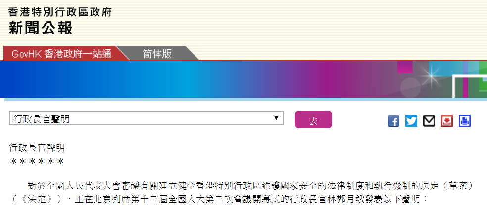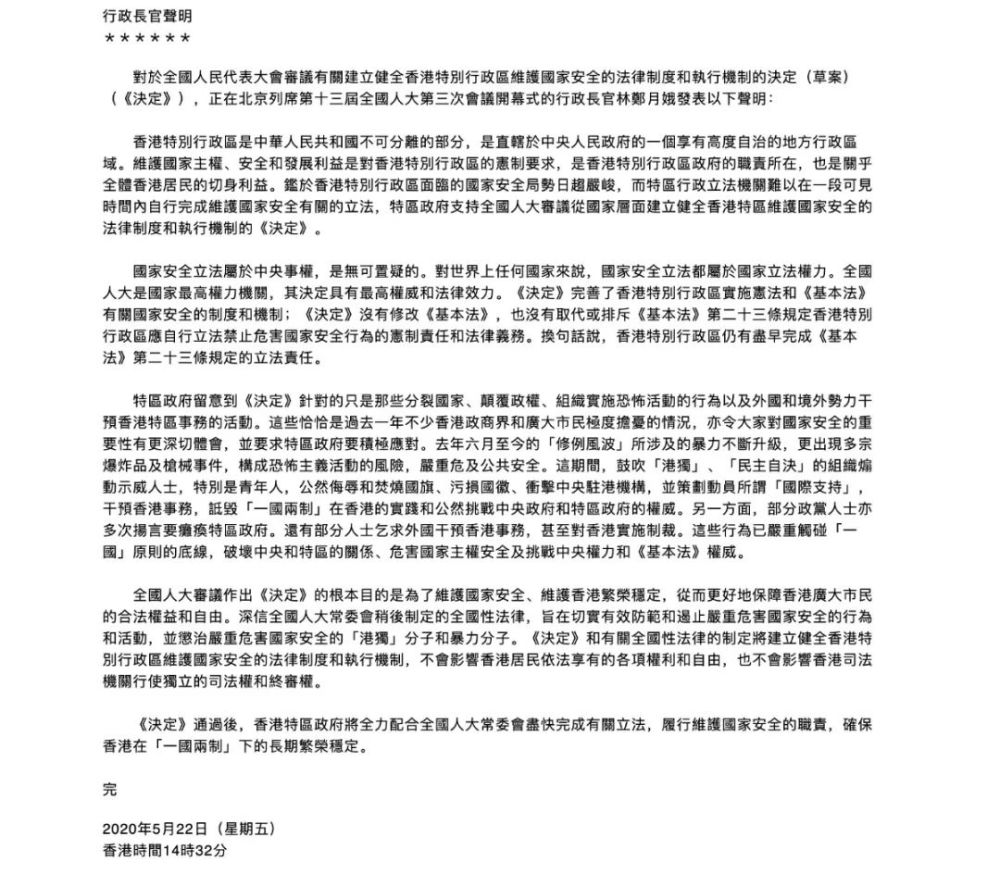 涉港决定草案出来了,全称很长,叫《全国人民代表大会关于建立健全香港特别行政区维护国家安全的法律制度和执行机制的决定(草案)》。草案正文部分共有7条。 从目前透露出来的内容看,正文不长。但篇幅是一回事,分量是另一回事。类似的,大家可以想想15年前的《反分裂国家法》。 在当前香港特别行政区国家安全受到现实威胁和严重损害的情况下,这一举措的必要性不需多言。至于紧迫性,草案第7条明确了施行时间——自公布之日起施行。 这是“一国两制”实践中具有重要意义的一件大事,必将产生积极而深远的影响。 5月22日,全国人大常委会副委员长王晨作关于涉港决定草案的说明 一个概念 要深入了解决定草案的背景和前因后果,首先,我们要明确一个概念——23条立法。 香港基本法第23条规定:“香港特别行政区应自行立法禁止任何叛国、分裂国家、煽动叛乱、颠覆中央人民政府及窃取国家机密的行为,禁止外国的政治性组织或团体在香港特别行政区进行政治活动,禁止香港特别行政区的政治性组织或团体与外国的政治性组织或团体建立联系。” 这一规定就是通常所说的23条立法,它明确了香港特别行政区负有维护国家安全的宪制责任和立法义务。 但自2003年23条立法受挫以来,这一立法在香港已被别有用心的人严重污名化、妖魔化。反对派刻意将维护国家安全和保障市民权利自由相对立,23条立法被长期“搁置”。由此,香港特别行政区的国家安全风险和漏洞日益凸显。 典型事件就是非法“占中”以及2019年的修例风波。尤其是后者自去年6月发生以来,反中乱港势力公然鼓吹“港独”、“自决”、“公投”等主张,公然侮辱、污损国旗国徽,从事暴力破坏国家统一、分裂国家的活动,其性质已带有本土恐怖主义色彩。 另一方面,一些外国和境外势力从遮遮掩掩到公然走上前台干预香港事务,“台独”与“港独”势力勾连合流也动作不断。他们与香港本土的反中乱港势力沆瀣一气,利用香港明显的法律漏洞和执行机制缺失,从事危害中国国家安全的活动。 面对香港这种在国家安全领域几乎“不设防”的状态,各界有识之士都认识到,必须秉持底线思维和风险意识,堵漏洞,补短板。这次,全国人民代表大会作为中国最高国家权力机关,依据宪法赋予的权力,决定出手了。 两步走 值得注意的是,这次采取“决定+立法”的方式,分两步予以推进。 第一步,全国人民代表大会根据宪法和香港基本法的有关规定,就该决定草案的相关问题作出若干基本规定,同时授权全国人大常委会就建立健全香港特别行政区维护国家安全的法律制度和执行机制制定相关法律; 第二步,全国人大常委会根据宪法、香港基本法和全国人大有关决定的授权,结合香港特别行政区具体情况,制定相关法律并决定将相关法律列入香港基本法附件三,由香港特别行政区在当地公布实施。 全国人民代表大会和全国人大常委会当仁不让唱主角。这是因为:第一,中央政府对所属地方行政区域的国家安全负有最大和最终责任,也享有和行使一切必要权力,这是基本的国家主权理论和原则,也是世界各国的通例; 第二,全国人民代表大会作为最高国家权力机关,是国家主权的代表。通过全国人大及其常委会执行,不但是对国家负责,也是对包括香港同胞在内的全体中国人民负责,具有无可置疑的正当性、合法性; 第三,全国人民代表大会的相关决定,是根据宪法第三十一条和第六十二条第二项、第十四项、第十六项的规定以及香港基本法的有关规定,更好体现从宪法和基本法出发的法治思维。 当然,本次宣布的决定草案只是迈出了第一步,后续全国人大常委会将会同有关方面及早制定香港特别行政区维护国家安全的相关法律,并加强专门机构、执行机制和执法力量建设,确保相关法律在香港特别行政区有效实施。 值得注意的一点是,决定草案明确,香港特别行政区根据基本法第23条规定仍然负有维护国家安全的宪制责任和立法义务,应当尽早完成维护国家安全的有关立法。任何维护国家安全的立法及其实施都不得同本决定相抵触。 由此可见,从国家层面建立健全香港特别行政区维护国家安全的法律制度和执行机制是一揽子法律和政治工程,后续操作值得期待。 5月22日,林郑月娥发表声明,表示支持涉港决定草案(图源:香港特区政府官网) 五个原则 十三届全国人大常委会副委员长王晨在作决定草案的说明时表示,必须遵循和把握好5个基本原则:一是坚决维护国家安全,二是坚持和完善“一国两制”制度体系,三是坚持依法治港,四是坚决反对外来干涉,五是切实保障香港居民合法权益。 5个原则其实是谈了5层关系,其中第3个原则包括,严格依照宪法和基本法对香港特别行政区实行管治,支持香港特别行政区行政长官和政府依法施政,牢固树立并坚决维护法治权威,任何违反法律、破坏法治的行为都必须依法予以追究。这一条具有极强的现实针对性,反中乱港势力可以对号入座。 第4个原则提出,必须坚决反对任何外国及其组织或者个人以任何方式干预香港事务,坚决防范和遏制外部势力干预香港事务和进行分裂、颠覆、渗透、破坏活动。对于任何外国制定、实施干预香港事务的有关立法、行政或者其他措施,国家将采取一切必要措施予以反制。这一条同样具有极强的针对性。亮剑指向谁,大家都非常