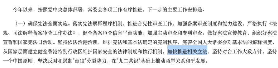 原标题:全国人民代表大会常务委员会工作报告全文发布 新华社北京5月31日电 全国人民代表大会常务委员会工作报告 ——2020年5月25日在第十三届全国人民代表大会第三次会议上 全国人民代表大会常务委员会委员长 栗战书 各位代表: 受全国人大常委会委托,我向大会报告工作,请予审议。 十三届全国人大二次会议以来的主要工作 十三届全国人大二次会议以来的一年多,在我们国家历史上极不容易、极不平凡。以习近平同志为核心的党中央统揽伟大斗争、伟大工程、伟大事业、伟大梦想,勇立潮头、担当作为,有效应对重大挑战、抵御重大风险、解决重大问题,推动党和国家各项事业取得新的重大进展。新冠肺炎疫情发生后,以习近平同志为核心的党中央将疫情防控作为头等大事来抓,习近平总书记亲自指挥、亲自部署,坚持把人民生命安全和身体健康放在第一位,领导全党全军全国各族人民打好疫情防控的人民战争、总体战、阻击战。经过艰苦卓绝的努力,武汉保卫战、湖北保卫战取得决定性成果,疫情防控阻击战取得重大战略成果,统筹推进疫情防控和经济社会发展工作取得积极成效。这再一次体现了习近平新时代中国特色社会主义思想的强大引领,展示了以习近平同志为核心的党中央运筹帷幄、果敢坚毅、领航定向、把舵前行的卓越领导能力,彰显了中国共产党领导和中国特色社会主义制度的显著优势,凸显了中华儿女自强不息,敢于战胜一切困难而不被任何困难所屈服,在磨难中成长、从磨难中奋起的英雄气概。 疫情发生以来,全国人大常委会坚决贯彻党中央决策部署,迅速行动、依法履职,作出关于全面禁止野生动物非法交易和食用的决定,防范公共卫生安全风险,促进社会文明进步。适应国家治理体系和治理能力现代化要求,根据公共卫生领域新情况新问题,部署启动强化公共卫生法治保障体系的立法修法工作,为守护人民生命健康安全筑牢法治防线。回应社会关切,主动宣传解读疫情防控法律,为疫情防控和经济社会发展提供法律支持。 一年多来,常委会认真行使立法权、监督权、决定权、任免权,共审议法律草案、决定草案48件,通过34件,其中制定法律5件,修改法律17件,作出有关法律问题和重大问题的决定12件;听取审议39个报告,检查6部法律实施情况,开展3次专题询问、7项专题调研,作出1项决议;决定批准5个双边条约;审议通过38个任免案,依法任免国家机关工作人员282人次,各项工作取得了新进展新成效。 一、确保宪法在治国理政各个方面得到全面实施 宪法是国家的根本法,是党和人民意志的集中体现。依法治国首先要坚持依宪治国,依法执政首先要坚持依宪执政。 新中国成立70周年之际,在党中央的领导下,根据宪法规定,常委会作出关于授予国家勋章和国家荣誉称号的决定,习近平主席签署主席令,将国家最高荣誉授予为新中国建设和发展建立卓越功勋的36位杰出人士和为促进中外交流合作作出杰出贡献的6位国际友人。这是现行宪法实施以来首次集中颁授国家勋章。作出关于对部分服刑罪犯予以特赦的决定,习近平主席签署发布特赦令。经过严格的法定程序,特赦了九类服刑罪犯共23593人,这是宪法规定特赦制度的又一次重大实践。 贯彻党的十九届四中全会精神,常委会听取审议了国务院关于香港特别行政区维护国家安全情况的报告,根据宪法和香港基本法的有关规定,研究拟订并审议了《全国人民代表大会关于建立健全香港特别行政区维护国家安全的法律制度和执行机制的决定(草案)》,决定提请本次大会审议。这是新形势下坚持和完善“一国两制”制度体系、坚持依法治港、维护宪法和基本法确定的特别行政区宪制秩序的重大举措,符合包括香港同胞在内的全体中国人民的根本利益。相信经过代表们的共同努力,一定能够顺利完成这一重要立法任务,为维护国家主权、安全、发展利益,确保香港长期繁荣稳定,提供更加有力的法治保障。 依法开展合宪性审查、备案审查。制定关于推进合宪性审查工作的实施意见,妥善回应涉及宪法有关问题的关切,依法纠正违宪违法的规范性文件,保证宪法得到切实遵守和执行。完善法规、司法解释备案审查体制机制,建成统一的覆盖全国的备案审查信息平台,初步建成国家法律法规数据库。连续3年听取审议备案审查工作情况报告,并向社会公开。2019年报送备案的行政法规、地方性法规、司法解释1995件,报送备案的特别行政区本地法律33件,研究处理公民、组织提出的审查建议138件。经审查,督促制定机关纠正与宪法法律规定和精神相抵触、不符合、不适应的规范性文件506件,维护了国家法制的统一、尊严和权威。 开展宪法宣传教育活动。组织6次宪法宣誓仪式,18名被任命人员进行宣誓,委员长会议组成人员主持并监誓,增强了国家工作人员的宪法观念。以“弘扬宪法精神,推进国家治理体系和治理能力现代化”为主题,举行第六个国家宪法日座谈会,带动各级各地开展丰富多彩的宪法宣传活动。召开纪念澳门特别行政区基本法实施20周年座谈会,推动“一国两制”方针和宪法、基本法的宣传和贯彻落实。 二、不断完善中国特色社会主义法律体系 紧扣全面依法治国,坚持立改废释并举,坚持质量与效率并重,加强重要领域立法,不断提高科学立法、民主立法、依法立法水平。 配合和促进全面深化