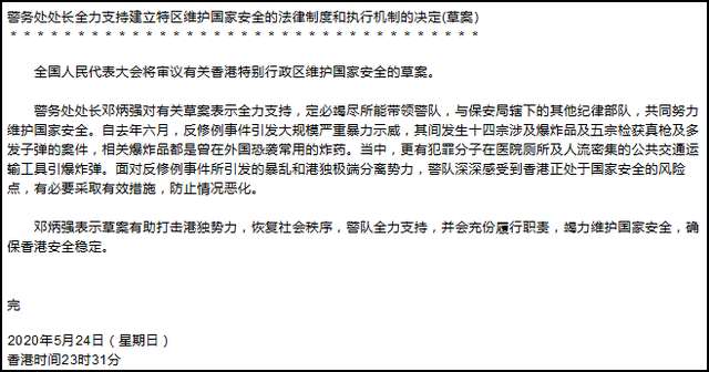 2019年香港发生“修例风波”以来,“港独”和激进分离势力活动日益猖獗,暴力恐怖活动不断升级,香港分裂分子甚至公开打出请求外国对华制裁甚至邀请美军登陆香港的旗号,同时外部干预势力和“台独”势力赤裸裸地加大干预香港事务,严重挑战“一国两制”原则底线,严重损害法治,严重危害国家主权、安全、发展利益,必须采取有力措施依法予以防范、制止和惩治。
