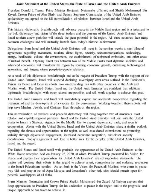 “破冰”并非无迹可寻 阿联酋与以色列的建交让全世界感到惊讶,但对包括阿米特在内的以色列人来说,两国关系“破冰”并非无迹可寻。“当2018年阿联酋播放以色列的国歌时,我们就知道,以色列与阿联酋建交是早晚的事。” 阿米特提到的是2018年在阿联酋举行的国际柔道联合会(IJF)。当年10月28日,以色列柔道运动员Sagi Muki赢得了81公斤以下类别金牌。组织者邀请了时任以色列文化和体育部长米里·雷杰夫给Muki颁奖。同时,以色列国歌在体育场中响起,以表彰Muki获得胜利。 今年5月19日晚,一架涂装纯白、没有显示航空公司名称的空客A330-200飞机从阿布扎比起飞,降落在了以色列本古里安机场。这次航班是联合国协调组织的,飞机上搭载了14吨支援巴勒斯坦抗击新冠肺炎的医疗用品,包括防护设备、呼吸机等物资。“这是有史以来阿以两国间的第一架商业直飞航班。”Amit无奈表示,但只是因为降落在了以色列,巴勒斯坦最终拒绝接受。 在8月13日的记者会上,特朗普还向记者透露,以色列与该地区的穆斯林邻国之间有望取得更多的外交突破。法新社引述他的话说:“正在发生的事情我无法谈论。” 8月16日,以色列情报部长科恩披露,阿联酋之后,接下来要和以色列建立外交关系的三个国家分别是巴林、阿曼和苏丹。“虽然以色列与阿曼、苏丹等国尚未签署和平协议,但以色列人更看重实际来往。”在阿米特看来,以色列一直在积极与中东国家交往,只是没被媒体大肆宣扬。 卡内基国际和平研究院估算,以色列与海湾阿拉伯国家之间的贸易额每年超过10亿美元,其中与阿联酋之间的交易占了很大一部分。 2020年8月17日,在以色列内坦亚的一条路边,以色列与阿联酋国旗一起飘扬。 2018年10月25日,内塔尼亚胡乘机抵达海湾国家阿曼首都马斯喀特,开展为期24小时“秘密访问”。2020年2月3日,内塔尼亚胡在乌干达会见苏丹主权委员会主席阿卜杜勒·法塔赫·布尔汉,被视为其外交中的又一个里程碑之举。 一周以来,阿以建交背后的隐秘细节被陆续曝光。据路透社报道,特朗普的女婿、白宫高级顾问贾里德·库什纳表示,阿联酋、以色列两国就关系正常化进行了大约为期一年半的会谈,于8月13日最终敲定相关细节。 特朗普在其推特账户上公布了以色列和阿联酋关于这项协议的联合声明全文。声明解释说,以色列选择中止对约旦河西岸部分地区的主权宣示——这些地区根据特朗普的“世纪协议”被以色列占领,而将重点放在“扩大与阿拉伯和穆斯林世界其他国家的联系”。 今年4月,以色列宣布将从7月1日开始推进对约旦河谷和约旦河西岸犹太人定居点“实施主权”的计划,涉及土地面积约占约旦河西岸地区的30%,这一计划遭到联合国、欧盟、阿拉伯国家等普遍反对。 但据英国广播公司(BBC)披露,内塔尼亚胡当晚发表电视讲话澄清称,对约旦河西岸部分地区实施主权的计划不会变,只是应特朗普的要求,以色列才“暂缓”实施该计划。 另据以色列媒体援引匿名官员的消息称,这项关系正常化协议中还包括一项“秘密条款”——美国将向阿联酋出售F-35战斗机。据称,阿联酋阿布扎比王储穆罕默德要求将这项条款纳入协议,使阿联酋能够购买价值数十亿美元的F- 35战机和美国其他先进武器。以色列媒体分析,若消息属实,将极大威胁以色列在中东地区的军事优势。 对此,内塔尼亚胡办公室发表声明否认该交易的存在:“这项历史性的和平协议未包括以色列同意美国与阿联酋之间的任何武器交易。从一开始,总理内塔尼亚胡就一直反对将F-35和其他先进武器出售给任何中东国家,包括与以色列达成和平协议的阿拉伯国家。” 但随后,特朗普在白宫的一场记者会上证实,阿联酋的确有意求购“相当数目的”F-35战机。他直言,阿联酋“有钱”,买得起“全球最出色的战机”,美方“正在审议”这笔军售。 特朗普的“算盘”远不只这些。他在白宫对媒体说,“既然坚冰已经打破,我希望更多阿拉伯和穆斯林国家会效仿阿联酋。” 对美国和以色列来说,沙特阿拉伯才是他们的最终目标,但这个目标艰难得多。沙特外交大臣费萨尔·本·法尔汉8月19日作出回应,认为在利雅得与以色列实现关系正常化之前必须先以国际协议和决议为基础“实现巴以和平”。这意味着沙特拒绝效仿邻国阿联酋。 有分析人士认为,沙特和以色列为了在共同憎恨伊朗的基础上悄悄建立关系,多年来一直在“静静地共舞”。作为阿拉伯世界第一大经济体、伊斯兰教两大圣地所在地,沙特的立场比阿联酋更微妙。法新社分析说,沙特如果与以色列正式建立关系,可能会被巴勒斯坦人及其事业的捍卫者视为“背叛”,也会破坏沙特作为阿拉伯穆斯林世界领袖的形象。 另有西方外交官和中东分析人士说,正在推进沙特王国经济改革计划的穆罕默德·本·萨勒曼王储愿意敦促巴勒斯坦人接受美国的中东和平计划。但据信他的这一想法遭到了父亲的否决。萨勒曼国王在一些关键问题上拥有最终决定权。