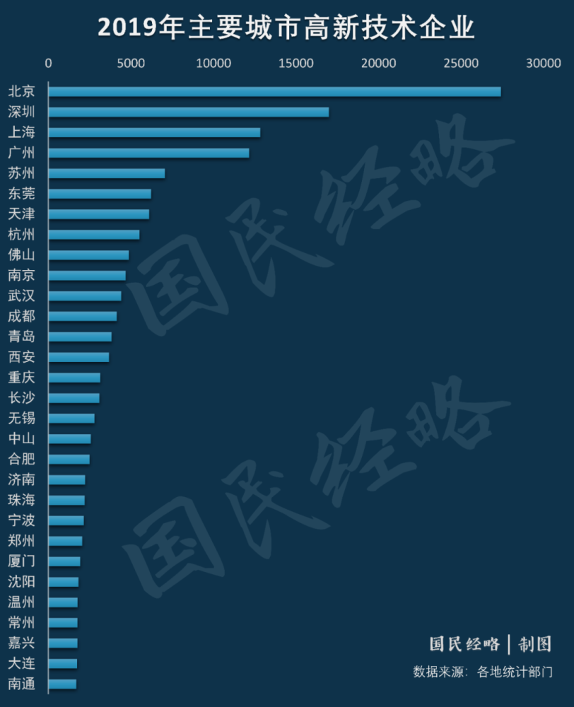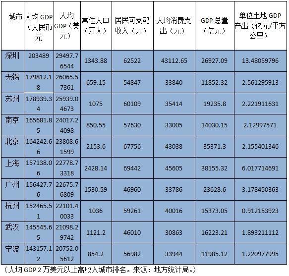 长三角高收入城市最多 24个万亿、准万亿GDP城市中,哪些跨越了中等收入,迈入高收入门槛? 以人均GDP达到1.25万美元标准测算,24座城市中,除重庆外其余城市皆达到了高收入城市标准。 人均GDP高达2万美元的高收入城市第一梯队,依次为深圳、无锡、苏州、南京、北京、上海、广州、杭州、武汉和宁波10座城市,除武汉外全属东部地区。其中,江苏有三座城市上榜,广东、浙江分别有两城上榜。 人均GDP在1.5-2万美元区间的高收入城市第二梯队,包括长沙、佛山、南通、青岛、福州、合肥、泉州、东莞、郑州和济南10座城市,也集中在中东部,福建和广东两省分别有两座城市上榜。 人均GDP在1.25-1.5万美元区间的城市有3座,分别是成都、西安、天津,为第三梯队。虽然成都、西安皆跨过高收入门槛,但在前两个梯队中,西部无一城市上榜。 若以省为划分标准,广东、江苏是大赢家,分别有4城上榜,二者激烈角逐,广东的深圳高居榜首,江苏的无锡、苏州、南京包揽第二、三、四名。 以行政类别划分,直辖市中,北京和上海位列第一梯队,天津在高收入城市中垫底,重庆仍未跨过高收入门槛。省会城市中有11个上榜,即南京、广州、杭州、武汉、长沙、福州、合肥、郑州、济南、成都、西安。 以城市群来划分,则高收入城市多集中于长三角城市群中,包括无锡、苏州、南京、上海、杭州、宁波和南通7座城市,这显示了长三角城市群的巨大发展动能。 近一年时间内,国家层面发布了多个推动该地区一体化发展的文件,包括2019年12月发布的《长江三角洲区域一体化发展规划纲要》,2020年4月发布的《长江三角洲地区交通运输高质量一体化发展规划》,提出了建设“全国发展强劲活跃增长极”、“轨道上的城市群”等战略部署。 21世纪经济研究院认为,在以城市群为特点的经济集群化、产业分工化发展背景下,长三角地区将在高收入城市的带动下,获得更大的突破空间。 成渝城市群中的双核重庆和成都,一个未能上榜,一个排在倒数第三,与倒数第一天津一道,虽位居GDP前十,但在高收入城市排名方面表现不佳。 21世纪经济研究院认为,人口体量过大是影响上述城市排名的一大原因,重庆、成都和天津的常住人口规模分别为3124.32万人、1658.10万人、1561.83万人。在GDP万亿城市中,除上海和北京外,这三座城市的人口规模排名靠前。 但人口数量并非决定一座城市是否进入高收入阶段的唯一因素。如重庆38个区县中,有18个区县在2019年的GDP未突破500亿元,这表明如何推进区县的经济增速,是重庆能否跻身高收入城市的关键。