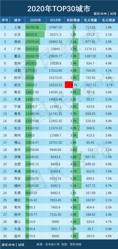 杭州财政收入增速居首位 看完各省份数据,2020年主要城市财政收入有哪些变化? 据《每日经济新闻》记者梳理,除4个直辖市外,有12个城市财政收入超过千亿。其中,杭州财政收入增速6.5%,远超其他城市,位列第一名。 杭州如何能突出重围? 该市统计局数据显示,2020年,全市数字经济核心产业实现增加值4290亿元,增长13.3%,高于GDP增速9.4个百分点,占GDP的比重为26.6%,较上年提高1.9个百分点;数字内容、软件与信息服务、电子信息产品制造产业增加值分别为3113亿元、3441亿元和1090亿元,增长12.7%、12.9%和14.7%。人工智能产业持续壮大,实现增加值340亿元,增长8.2%。 近五年,杭州财政收入稳步提升,年均增长11.2%,同时,财政收入质量很高。五年来,全市税收收入占一般公共预算收入的比重年均91.8%,稳居全国前列。从产业来看,信息传输软件、金融、科学研究和技术服务、先进装备制造等行业税收贡献稳步提高,数字经济领跑特征明显。 另一个值得关注的城市也在长三角地区,那就是苏州。 2020年,苏州经济运行经受住了疫情冲击等多重考验,一般公共预算收入达到2303亿元,位居全国第四。 这主要得益于苏州的高技术制造业。2020年,苏州荣获全国工业稳增长和转型升级成效明显市称号,规模以上工业总产值3.48万亿元,增长4%;四大先导产业产值达到8718亿元,增长11.5%,其中生物医药产业产值达到1187亿元;工业投资1528亿元,增长27.4%。 五年来,苏州服务业增加值占地区生产总值比重达到52%。规模以上工业总产值稳居全国城市前三,高新技术产业、战略性新兴产业产值占比分别达到51%和55.7%,高新技术企业达到9772家,生物医药产业入选国家战略性新兴产业集群。 总结之后不难看出,杭州领跑的背后,是强大的数字经济在支撑;而苏州取得第四的好成绩,则主要是高技术制造业的贡献。 从直辖市来看,四个城市财政收入都出现负增长,其中天津降幅最大,但这并不是天津第一次出现收入负增长。 天津市财政收入在经历2016年的2723亿元高点后,2017、2018年两年连续下降,2019年回升至2410亿元后,2020年降至1923亿元。同时,2020年全市地区生产总值约14084亿元,在财政过千亿的城市中排名第11位。 天津市政府工作报告指出,天津存在的问题和不足有:市场主体数量偏少、结构不优,国有企业市场化机制不活,民营企业发展不充分;创新平台聚集不足,顶尖学科和人才储备不够,产业创新能力有待增强;营商环境对标一流仍有差距,市场化法治化国际化水平需进一步提升等。