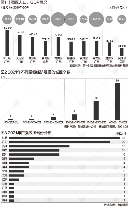 南山区GDP超13个省会城市 从区域分布看,百强区中,东部地区有68个,中部地区14个,西部地区16个,东北地区2个。从省份分布看,百强区位于16个省份,江苏、广东、浙江、山东和四川都超过10个。江苏以22个位居榜首,广东以20个紧随其后。 以往在百强县中入围数量屈指可数的第一经济大省广东,在百强区中多达20个。在前十名的市辖区中,广东占据8个。广东城区整体实力超过了江苏、浙江等省份。 广东省体制改革研究会执行会长彭澎对第一财经分析,广东经济要素主要集中在珠三角地区,而珠三角最发达的县如顺德、南海早已改为区。南海和顺德在改区之前,在我国百强县榜单中都位居前列。另外,广东坐拥广州、深圳两个一线城市、超大城市,中心城市引领作用很突出。 深圳南山区、广州天河区、深圳福田区位居前三。南山区2020年GDP实现6502.22亿元,总量占全市的23.5%;其上市公司数量也是最多的,有“世界500强”腾讯控股、中国恒大,也有行业翘楚迈瑞医疗、大族激光等。 根据第一财经记者梳理,去年南山区的GDP超越了石家庄、南昌、南宁等13个省会城市。 中国(深圳)综合开发研究院信息部部长郑宇劼对第一财经分析,南山区科创产业发展走在全国前列。从大的趋势来说,深圳这四十多年是在往珠江口发展,很多大型基础设施都在往西聚集。另一方面,南山有蛇口工业区和深圳高新区这两个重大平台。尤其是深圳高新区,在培育科创企业方面走在全国前列。 广州的天河区位居第二。与南山区相似,天河区也是高新产业、总部经济、金融等现代服务业的集聚地。“十三五”期间,天河区经济实力不断跃升,地区生产总值跨越2个千亿级台阶,从2015年的3432.8亿元增长至5312.8亿元,连续14年位居广州全市第一。