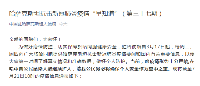 驻哈萨克斯坦大使馆:在哈中国公民感染人数继续扩大,疫情形势严峻