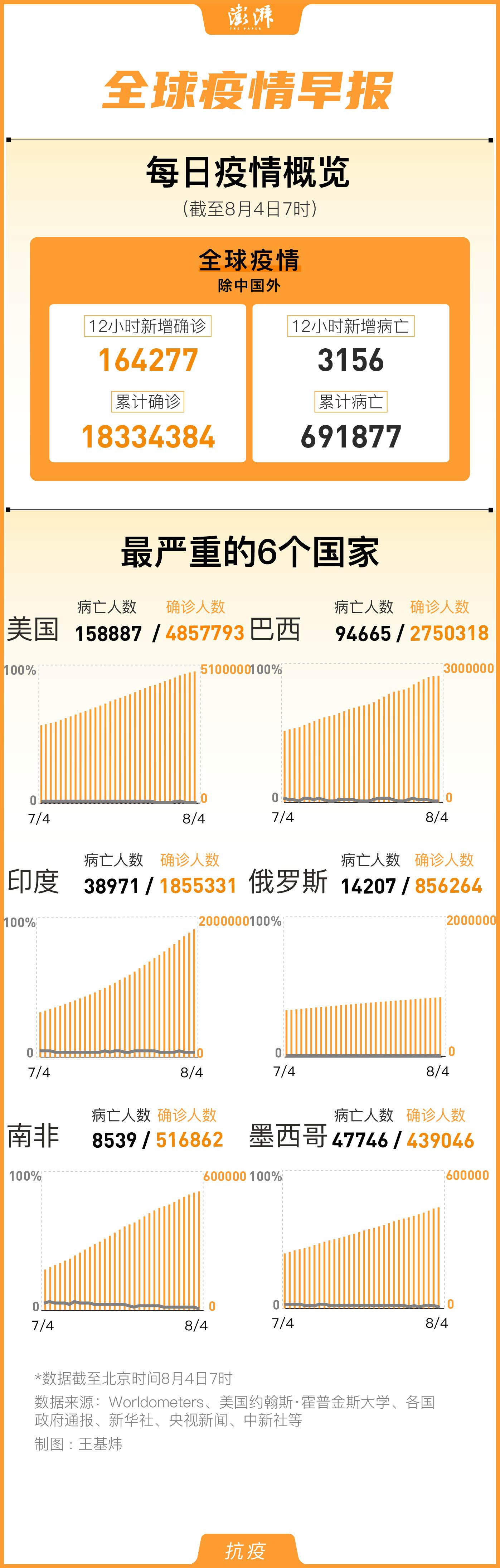 海外网8月7日电 据Worldometer的实时数据,截至北京时间8月7日20时左右,全球新冠肺炎确诊病例达19294150例,死亡病例718339例。包括美国、巴西、俄罗斯等国在内的至少22个国家单日新增确诊病例数均超过千例,其中美国新增59948例,巴西新增53139例,印度新增62538例,俄罗斯新增5241例。 印度新增确诊病例首超6万例 累计确诊逾200万例 印度卫生部官方网站8月7日公布的最新数据显示,印度新冠肺炎确诊病例升至2027075例。在过去24小时内,印度新增确诊病例62538例,为单日最大增幅;新增死亡病例886例,累计死亡41585例。目前,印度单日新增确诊病例已连续9天超过5万例。 英国广播公司指出,印度用了20天的时间使其病例总数从100万例发展到200万例,这比美国(43天)和巴西(27天)所用的时间都要快。印度每天的新增病例数也非常多,而令该国控制疫情变得困难的原因也与印度的规模、人口和多样性有关。印度政府被指因各种原因低估了新冠肺炎死亡人数,包括延迟报告、如何确定死因是否与新冠病毒有关等等。与此同时,在持续了近两个月的严密封锁后,印度在低死亡率的刺激下重新开放,导致一些地区的病例出现激增。 巴西新增确诊病例逾5.3万例 计划拨款19亿雷亚尔生产新冠疫苗 据巴西卫生部当地时间8月6日晚公布的最新数据,该国单日新增新冠肺炎确诊病例53139例,累计确诊2912212例;新增死亡病例1237例,累计死亡病例98493例。目前,巴西确诊病例和死亡病例仍居全球第二,仅次于美国。 6日,巴西总统博索纳罗签署临时政令,计划拨款19亿雷亚尔(约合24.8亿人民币)用于生产1亿支英国牛津大学研发的新冠疫苗,该政令已提交巴西国会审议。目前该种疫苗已在里约热内卢州、圣保罗州等地展开临床试验。 俄罗斯新增确诊病例5241例 全球首个新冠疫苗将在俄注册 据俄罗斯新冠病毒防疫官网8月7日公布的最新数据,俄罗斯新增5241例新冠肺炎确诊病例,累计确诊877135例;新增119例新冠肺炎死亡病例,累计死亡14725例。 俄罗斯卫生部副部长格雷德涅夫在7日称,全球首个新冠疫苗将在8月12日于俄罗斯进行注册。格雷德涅夫向记者表示,疫苗最后阶段的试验正在进行中:“我们必须确定疫苗是安全的,医护人员和老年群体将会优先获得接种。” 该疫苗由加马列亚研究所和俄罗斯国防部共同研发,已经于6月18日开始试验阶段,共有38名志愿者参与,并全部取得免疫。俄罗斯卫生部长穆拉什科曾表示,俄罗斯有望在今年10月开展大规模疫苗接种工作,所有费用都会由国家预算覆盖。 南非新增确诊病例8307例 累计确诊近54万例 当地时间8月6日,南非卫生部确认,南非当天新增新冠肺炎患者8307人,新冠肺炎患者总人数达到538184人,该国已检测3149807人,当日检测36616人。当日新增306例新冠肺炎死亡病例,目前南非共9604人因新冠肺炎去世。截至目前共387316人康复。