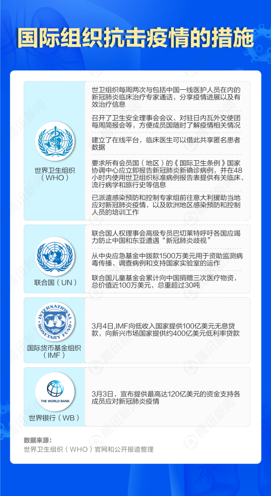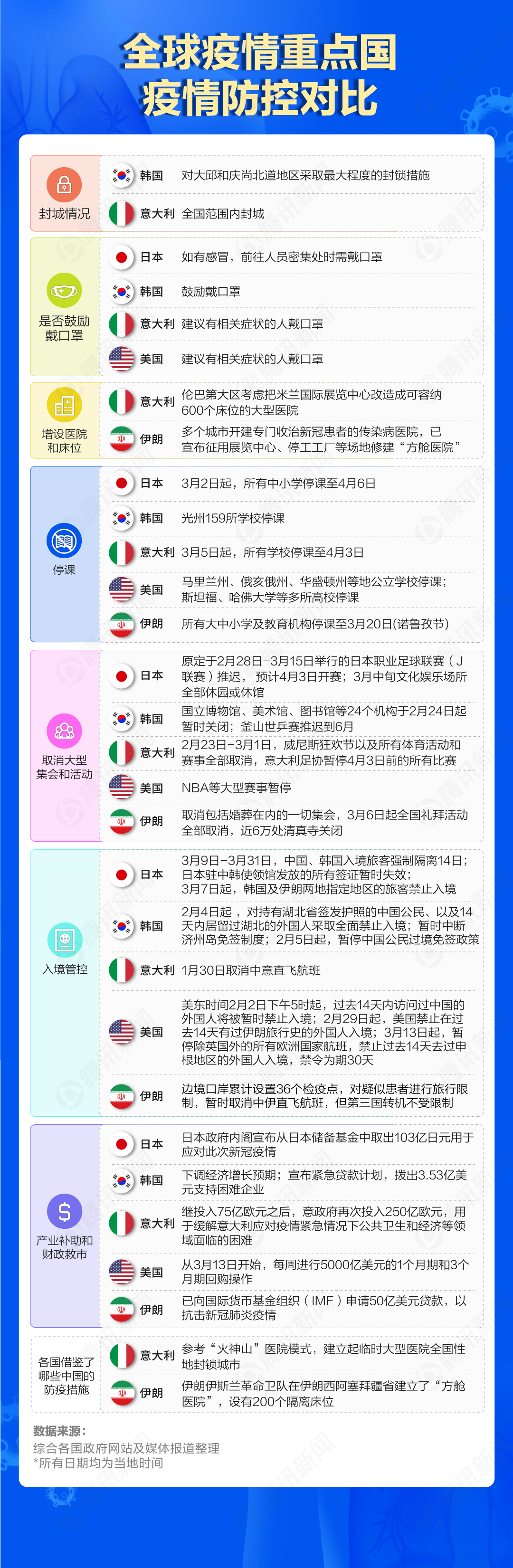 据世卫组织数据,截至3月12日,全球累计117个国家出现新冠肺炎疫情,确诊人数超过12万。除中国外,意大利、伊朗、韩国、日本、美国成为主要疫情国。那么,这5个国家应对疫情各自出了哪些措施? 美国大力救市 意大利、伊朗借鉴中国医院模式 严峻疫情之下,日本、韩国、意大利、美国和伊朗五国的抗疫措施各异。仅意大利和韩国采取了封城措施,意大利的封城更是覆盖全国;在“佩戴口罩”方面,则有明显的文化差异,日韩卫生部倡议人们在人群密集处佩戴口罩,美国则明确表示仅鼓励“有相关症状的人戴口罩”,以免造成资源浪费和恐慌蔓延。 同时,美国也是五国中旅行禁令最严格、救市力度最大的国家:当地时间3月13日起,美国禁止除英国外的欧洲申根国家旅客入境美国,禁令为期30天;而为了安抚市场,美联储每周将对5000亿美元的1月期和3月期国债进行回购操作。 虽然国情不同,但是伊朗和意大利借鉴了中国的抗疫措施。在疫情严重的多个省份,伊朗宣布征用展览中心、停工工厂等场地建设临时“方舱医院”;而在意大利,伦巴第大区的米兰国际展览中心将被改造为意版“火神山”,届时可容纳600个床位。 联合国、IMF联手援助各国 除了国家自救,国际组织也积极参与了疫情防控工作:世卫组织、联合国、国际货币基金组织和世界银行等纷纷行动,从医疗、物资和经济运行等方面提供援助。 世卫组织前期以协调和观测为主,3月1日起,世卫组织开始派遣感染预防和控制专家组前往意大利,协助和培训当地医护;联合国专注物资救援,已累计向中国捐赠了近100万美元的医疗物资,总重超过30吨;国际货币基金组织和世界银行则提供多项低利率贷款服务,伊朗中央银行行长3月12日宣布,已向国际货币基金组织申请50亿美元贷款。 目前疫情分布在北温带 南半球或迎来风险期 马里兰大学医学院人类病毒研究所、全球病毒网络(GVN)卓越中心的研究指出,目前,疫情中心分布在北纬30°-50°,最新的疫情分布地图也可以印证这点。但是为什么疫情会在大洋彼岸的美国迎来爆发期,却没有在紧邻中国的东南亚肆虐? 研究表明,适宜的温度和湿度是病毒生存的重要条件。疫情严重的国家和城市气温类似(5-11摄氏度),湿度类似(47-79%)。也就是说,新冠病毒有可能“喜冷怕热”。 该研究还预测,接下来多个地区风险较高,包括东北亚、中亚、高加索地区、东欧、中欧、不列颠群岛、美国东北部和中西部以及不列颠哥伦比亚省。同时,随着南半球气候转冷,6-9月之间,新西兰、澳大利亚、南非、阿根廷和智利等地的新冠病毒防治将变得尤为关键。