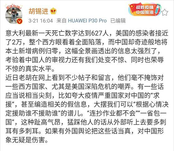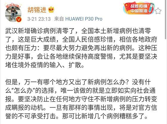 武汉新增确诊病例清零了,全国本土新增病例也清零了,这是巨大成绩,全国人民倍感珍惜,相信各地政府也颇有压力:要尽最大努力避免再出新的病例。这种压力是好事,会让各地继续保持高度警惕,尤其是要坚决堵住境外疫情的输入、扩散。 但是,万一有哪个地方又出了新病例怎么办?没有什么“怎么办”的选择,唯一该做的就是立即如实向社会通报。要坚决防止在任何地方守住不新增病例的压力转变成瞒报的动机。一旦有那样的事情出现,将是对官方信誉的不可承受打击。那可比新增几个病例糟糕多了。 中国老百姓眼里是最揉不进沙子的,美国能够在很长时间里用不检测实际隐瞒了大量疫情,在中国,那会引起舆论海啸的。 由于有境外病例的不断输入(光昨天一天就输入了41例),也由于存在治愈病人复阳的个别情况,中国重新出现少数本土病例的可能性是高度存在的。如果说湖北或者别的哪个省重新出现个别病例或者小范围的传染情况,相信公众是能够理解、接受的,那样的情况也不会引起舆论的严重骚动。当然了,人们强烈不希望看到某个地方出现严重聚集性传染,人们强烈希望新出现的病例能够被迅速发现,患者的所有密接线索都被立即锁定,使得疫情较大范围的传播不再成为可能。 人们最不能接受的是瞒报。不能不说,一些人对此是有担心的。这种担心会成为舆论场的心理暗示,使得任何这方面的消息不论真假都会成为焦点。这种情况下,地方政府哪怕在发生新病例时通报得稍微慢了点,甚至是正常范围内的情况研判,拖得时间稍长了点,都可能引来“瞒报”的猜忌。 因此,老胡想特别提醒各地,一旦出现新病例,要毫不犹豫地第一时间公布出来。如果相关流行病学信息还没有完全搞清,也不必等搞清了再通报,可以边公布边调查,坚决避免拖延。 老胡相信,经过这一轮的抗疫,中国的防疫体系已经更加成熟了,整个体制总体上决不会存在一旦出现新疫情对之进行瞒报的动机。我也希望公众对此要有信心,不要过度敏感,好像大家就竖着耳朵、睁大眼睛扫描新疫情的蛛丝马迹一样。不要那么紧张,都放松些,如果新出了病例,全社会都坦然面对就是了,这种坦然也应表现在信息沟通上。 来源:胡锡进微博