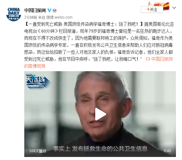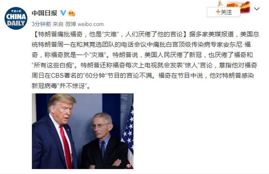 原标题:特朗普:福奇是个灾难,如果听他的,我们会死50万人 [环球网报道 记者 李东尧 乌元春]“人们已经厌倦了听到福奇与这些白痴的声音”、“如果我听了他的话,我们就会有50万人死亡”、“这个家伙就是个灾难”……当地时间10月19日,曾感染新冠病毒并痊愈的美国总统特朗普,再次炮轰美国顶级传染病专家安东尼福奇。 综合美国消费者新闻与商业频道(CNBC)与美国全国广播公司(NBC)报道,美媒披露了特朗普19日在与他的连任竞选团队的通话内容。CNBC称,特朗普认为,福奇就是一场“灾难”,也可能是一个“白痴”。特朗普还声称,美国人已经“厌倦”了新冠病毒,“厌倦”了福奇。 “人们已经厌倦了新冠病毒”,特朗普与团队成员通电话时说。他还称,“人们已经厌倦了听到福奇与这些白痴的声音,这些人,这些人把事情搞错了。” NBC报道此事时称,他们获得了这通电话的内容记录。 特朗普说道,“如果我听了他的话,我们就会有50万人死亡,”几秒种后他又补充,“如果我们听了他的话,我们现在就有70-80万人死亡。” 特朗普还称,“每次(福奇)上电视,都会投下一颗‘炸弹’。”CNBC称,特朗普显然指的是福奇此前在媒体上露面,包括18日晚间接受哥伦比亚广播公司节目采访时福奇称,对于特朗普自己感染新冠,他“绝对不会”感到惊讶。 CNBC提到,特朗普也解释了为什么他没有解雇福奇,尽管对他不满意。“如果你解雇他,那将是一颗更大的‘炸弹’。”“这个家伙就是个灾难”。