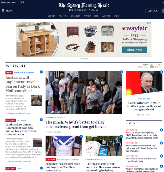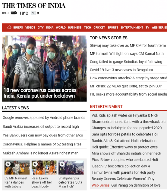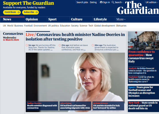 本文为国际媒体头条速览第371期,独家供稿腾讯平台,未经授权,不得转载。 英国《卫报》:卫生部副大臣多里斯感染后被隔离 卫生部副国务大臣娜丁·多里确诊感染新冠病毒。据悉,她于上周五出现症状,传染源目前不得而知。这也是英国首位高官染病,不禁让人担心议会和政府内传播风险。据悉,多里斯过去一周在议会与几百人会面;国际妇女节时,她还参加了唐宁街的一个活动,当时首相约翰逊及其未婚妻卡丽 西蒙兹也出席。多里斯目前正接受隔离和治疗。她在社交网站上称,自己更担心年迈的母亲。 英国广播公司:纽约州设立病毒“控制区”,派军队管控 纽约州州长科莫宣布在纽约市以北小镇New Rochelle 周边设立一个1英里的冠状病毒“控制区”。他说,该镇可能是美国最大的感染集中地。当局将动用国民警卫队清理小镇学校,并向被隔离的民众发送食品。但只有大型公共场所关闭,不会有旅行限制。纽约州目前确诊173例,是全美最多的一个州,其中108例是在New Rochelle镇所在的韦斯特切斯特郡。据约翰·霍普金斯大学的统计,截至周二下午,美国总共确诊病例为804例。 美国能像意大利那样做吗?BBC提出一个不好回答的问题。意大利禁止大型集会,不许国民离开本地区。专家们说,美国可能最终效仿意大利,对大量人口进行隔离,但会面临极大的阻力。哥伦比亚大学国家备灾研究中心主任欧文·雷德勒纳表示:“美国采取那种措施的可能性很小。这无异于戒严。政府下令关闭公共场所,不让民众出行,这是美国人迈不出的大步子。”而国立卫生研究院的专家安东尼·福西曾说过“什么都有可能”。目前美国病毒检测数量较少,实际感染规模仍是未知数。 法国欧洲新闻电视台:意大利死亡人数激增,邻国关闭边界 意大利宣布周二又有168人死于新冠肺炎,全国病例突破1万。邻国奥地利关闭了边界,禁止任何来自意大利的人入境,除非拥有健康证明。滞留在意大利的奥地利人将被接回并隔离。斯洛文尼亚随后也宣布关掉与意大利的边界。法国总统马克龙称这是“一个坏决定”。另外,西班牙右翼Vox党秘书长参加集会后病毒检测结果呈阳性。欧洲议会主席因近期去过意大利而在家自行隔离。 澳大利亚《悉尼先驱晨报》:澳大利亚将对意大利实行旅行禁令 澳大利亚政府宣布,将从11日下午6时开始对从意大利实行旅行禁令。这意味着来自意大利的非澳大利亚公民不得入境,而澳大利亚公民入境后必须先进行14天的隔离,然后才能回家。不过,就在10日晚上,维多利亚州3人病毒检测结果呈阳性,他们全部是从美国抵达墨尔本的。另外,由于担心疫情影响门票销售,主办方宣布塔斯马尼亚州最大的旅游招牌——“Dark Mofo”冬季艺术节取消。 与此同时,澳大利亚联邦政府首席医疗官布伦丹·墨菲称:最近一些不需要检测的人都在要求检测。如果没有旅行或与患者密切接触,哪怕出现似流感症状,根本无需检测,否则会给澳大利亚医疗系统带来负担。目前,澳大利亚确诊病例已过百。 《印度时报》:印度新增18例新冠肺炎病例,喀拉拉邦实行限制措施 截至周二,印度累计确诊新冠肺炎病例62例。值得一提的是,昨日新增18例病例中,有5例来自印度西部城市浦那。该市一对夫妇及其女儿参加了一支40人迪拜旅游团,3月1日回印度以后确诊,连带开车送这家人从孟买回浦那的司机也被感染,还有一人也是这支旅行团成员。另外,喀拉拉邦目前确诊升至14人,当地政府决定采取关闭教育机构、电影院等严厉限制措施。 韩联社:韩国报告新增242新冠肺炎病例,总数现在达7755例 韩国新增病例出现反弹,主要与首尔一家呼叫中心有关。那里出现聚集性感染,至少90人病毒检测结果呈阳性。目前呼叫中心雇员和实习生以及密切接触者已被要求进行检测。