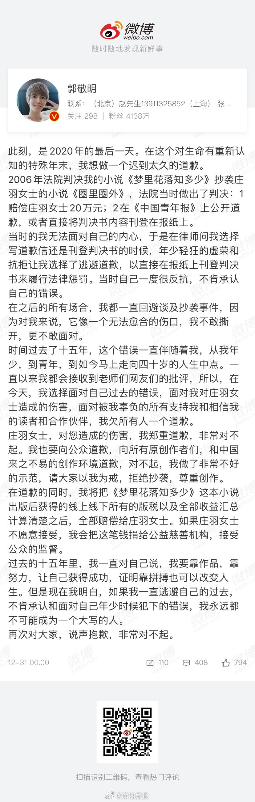 原标题:马上评|郭敬明道歉后,娱乐圈能树立起正确的三观吗? 大半夜的,郭敬明终于为自己的抄袭行为道歉了。这是一天中最晚的时候,这个道歉也确实来得够晚。 就像郭敬明说的,只要还在逃避自己的过去,不肯承认和面对自己年少时候犯下的错误,“永远都不可能成为一个大写的人”。有人质疑他的动机,有人不屑他的态度,但不管怎么说,那句“请大家以我为戒,拒绝抄袭,尊重创作”,依然是有分量的。尤其是能从郭敬明口中听到这样的表态,对整个中国文艺创作环境而言依然是有象征意义的。 然而,整整十五年,真的太久了。 当年,我也是捧着《梦里花落知多少》,幻想凄美爱情的小屁孩。今天,我已经和郭敬明一样,成了不折不扣的中年人。那段青春岁月,已经消失在了风中。现在,当我终于亲眼目睹小四老师姗姗来迟的道歉,心情只能用五味杂陈来形容。 从世俗的角度来说,此时此刻的表态不会给郭敬明带来多少损失。早已功成名就的他,就算把所有版税都赔偿给原作者,也换不回已经逝去的时间、已经被伤害的感情。 更重要的是,这十五年留下了一个令人扼腕的反面教材:抄袭者大红大紫、名利双收,而原作者反倒遭受了不少粉丝的恶意攻击和诋毁。