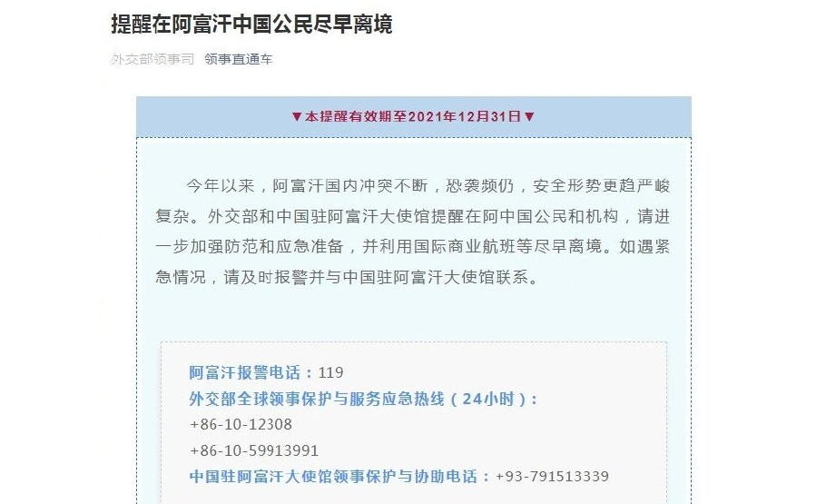 【环球网报道 记者 侯佳欣 程是颉】“美国在阿富汗失败了……他们的遗产是一个饱受战争蹂躏的国家。” 阿富汗前总统卡尔扎伊20日如此痛批在阿进行近20年“反恐战争”的美国。就在同一天,中国外交部罕见提醒本国在阿公民“尽早离境”。由于美国自顾自地撤军,阿境内暴力、恐袭事件剧增,阿富汗塔利班与政府安全部队的战斗空前升级。 中国外交部罕见提醒的背后透露出什么信息?阿富汗现今局势如何?在阿中国公民处境又是怎样? “尽早离境”提醒表明形势非常严峻 “今年以来,阿富汗国内冲突不断,恐袭频仍,安全形势更趋严峻复杂。”20日,中国外交部和中国驻阿富汗大使馆提醒在阿中国公民和机构,进一步加强防范和应急准备,并利用国际商业航班等尽早离境。 清华大学国家战略研究院研究部主任钱峰22日告诉环球时报-环球网记者,外交部和使馆发布这样的提醒是比较少见的,这侧面反应出阿富汗的形势非常严峻,阿国内的暴力冲突已经达到了新的阶段。 兰州大学阿富汗研究中心主任朱永彪分析说,中国使馆发出警告的主要原因是当地安全形势恶化,遭遇袭击绑架的群体范围明显扩大,外国组织机构基本都在撤,比如澳大利亚驻喀布尔使馆,英法也有可能,国际NGO基本都在减员。 朱永彪说,之前阿富汗的形势虽然一直不稳,但在一个可控范围之内。最近,形势恶化很多,在阿外国人的安全能得到保障的可能性实际上非常低。未来一段时间,阿境内包括喀布尔可能会陷入一定程度的混乱。 就阿富汗局势,中国外交部发言人赵立坚22日在例行记者会上表示,今年以来,阿富汗国内冲突不断,恐袭频仍,安全形势更趋严峻复杂。美国作为影响阿富汗问题的最大外部因素,对阿当前局势负有不可推卸的责任。 赵立坚称,20年前,美国以反恐为名出兵阿富汗,但在打击“基地”组织和塔利班的同时,造成大量平民伤亡,给阿富汗人民带来深重灾难。20年间,美在阿犯下诸多罪行,劣迹斑斑、信誉扫地。20年后,阿富汗安全形势依然复杂严峻,恐怖主义问题远未得到解决。美国突然宣布完全自阿富汗撤军,直接导致阿富汗安全形势急转直下,严重威胁阿富汗和平稳定与人民生命安全。美国留给阿富汗人民的,是一个千疮百孔、危机四伏的未来。美军应以负责任的方式撤离,确保阿富汗局势平稳过渡,避免恐怖势力趁乱坐大给阿富汗人民带来更多动荡和苦难,损害地区和平与稳定。 眼下“和塔利班全面夺权前的(上世纪)90年代一样” 2020年5月,阿富汗安全部队坐在一辆军车内。图源:法新社 美国宣布从阿富汗撤军以来,阿富汗塔利班运动的势头越来越猛。继过去几周攻占了数十个农村地区后,20日又攻入北部两个省会。 为应对塔利班的攻势,19日,阿富汗总统加尼让上世纪90年代曾与塔利班战斗过的前陆军参谋长俾斯麦拉·汗·穆罕默迪出任国防部长。加尼还重新任命了另一个强力部门内政部的负责人。25日,加尼和阿民族和解高级委员会主席阿卜杜拉将访问美国白宫。 对此,塔利班声称,加尼的华盛顿之行“毫无价值”,塔利班仍致力于和谈,但坚决主张在阿实行“真正的伊斯兰体系”,这是结束战争和确保权利(包括女性权利)的唯一途径。 据英国《卫报》报道,与2020年相比,阿富汗今年1至3月的平民伤亡增加29%。政府数据显示,今年5月与恐怖主义有关的死亡人数为4735人,远高于去年的1645人。 对于当下的形势,卡塔尔半岛电视台形容称,“和塔利班全面夺权前的(上世纪)90年代一样”。 “美国在阿富汗失败了……他们的遗产是一个饱受战争蹂躏的国家,正处于‘彻底的耻辱和灾难之中’。”阿富汗前总统卡尔扎伊20日接受美联社专访时表示,20年前国际社会带着打击极端主义和带来稳定的明确目标来到阿富汗,“但极端主义在今天却达到顶峰”。 在卡尔扎伊看来,美国和北约的军事行动是强硬和完全错误的,行动并不是针对极端主义或恐怖主义,而是针对阿富汗人的村庄和家园,并在阿建立针对阿富汗人民的监狱。 美国在阿富汗开战近20年,付出2400多人死亡、耗费2万亿美元的代价,留下的却是一个烂摊子。“美国之音”21日承认,阿国内战斗空前升级,给美国主导的缓慢的和谈带来新的打击。卡塔尔正在主办这场对话。 谈及阿富汗国内现状,钱峰介绍说,面对不断升级的暴力冲突,阿富汗当地人对于该国前景普遍非常担忧。大多数民众希望政府军与塔利班停止交战,从国家和民族的利益大局出发,按照此前达成的协议开启民族和解及和平进程,早日建立包容和解的政治解决框架,而不是进一步诉诸暴力,以暴制暴。 中企营地:周边时常能听到枪声,已储备应急物资 关于在阿中国人的情况,钱峰介绍称,长期以来,阿富汗国内安全形势不稳,因此除了使馆必要人员、项目工程人员及投资经商人员外,在阿中国公民并不是很多。此外,疫情暴发以来,已有不少中国人通过各种方式回国。但受疫情等因素影响,中阿之间的航班已经暂停,在阿中国人回国需要前往中东其他地区进行中转。 据环球时报-环球网记者了解,从去年底开始,大部分在阿中国公民陆续离开,但部分工程项目仍有人留守。一名在喀布尔周边工作的中企员工称,考虑到安全形势和疫情,工程很难继续开展,留守人员均在营地内活动。从营地感受到的情况来看,周边地区警报频传,时常能够听到枪声,政府军的直升机经常在空中盘旋。 目