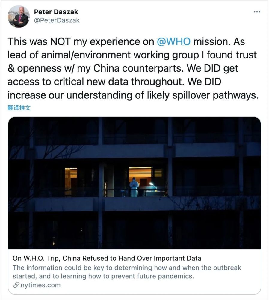 一天前,《纽约时报》刚刚惹怒众多专家 值得一提的是,就在《纽约时报》刊发这篇对达萨克专访的前一天,这家媒体刚刚被这位世卫专家严厉斥责。 2月9日,世卫专家组完成在中国的病毒溯源研究工作后,当天下午同中国专家一道召开面向全球的新闻发布会。发布会上,双方一致认为,无证据表明2019年12月前病毒就在武汉传播,且病毒实验室泄露导致病毒传播的假说极不可能。世卫专家还多次肯定中方在调查期间给予他们的帮助和开放透明的态度。 这样的调查结果显然没能让美国一些媒体和政客得偿所愿,美国国务院发言人内德·普莱斯(Ned Price)在当地时间2月9日的记者会上难掩“酸气”,拐弯抹角地攻击抹黑中国和世卫专家组。 而在2月12日,《纽约时报》甚至还援引多名世卫组织专家的“说法”,宣称中国“拒绝分享可能让世界更了解新冠起源的原始数据”。报道发出后,文章中援引的多位专家陆续发文辟谣,称自己的观点被扭曲,纷纷指责《纽约时报》的行为。 达萨克和丹麦北西兰医院临床研究中心主任西娅·费舍尔(Thea Fisher)便是文章中出现的世卫专家。费舍尔在推特上表示,他们说的话被故意歪曲,这为重要的科学工作蒙上了阴影。 随后达萨克则回复费舍尔称:“听听、听听!我们花时间和记者解释了我们在中国长达一个月疲惫工作中的关键发现,而我们同事所说的话却在工作还没开始前就被(媒体)断章取义地用来编自己的报道,这真的令人失望。《纽约时报》,你真无耻!”此后,达萨克的愤怒也得到了其他专家的响应。