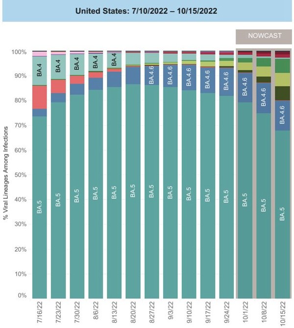 排在第二的是BA.4.6,占确诊的12.2%,占比略有下降。而另外两种奥密克戎亚型BQ.1和BQ.1.1则在迅速扩散,分别占确诊的5.7%。在不到一个月时间里,BQ.1和BQ.1.1就占到美国确诊的10%。 BQ.1和BQ.1.1在纽约和新泽西州的扩散最为迅速,美国疾控中心预计这两州的新增确诊中有20%为BQ.1和BQ.1.1感染。 BQ.1和BQ.1.1均为BA.5衍生的亚型,科学家9月初才首次对BQ.1命名。研究人员初步分析认为,BQ.1和BQ.1.1的传播速度更快,可逃避此前感染或接种产生的抗体。 BQ.1.1的免疫逃逸能力更强,还能逃避感染BA.5产生的抗体。包括Bebtelovimab和Evusheld在内的部分治疗药物可能对BQ.1.1无效。相关研究尚未经过同行评审。 美国国家过敏症和传染病研究所所长福奇上周表示了对BQ.1和BQ.1.1的担忧。他警告,这两种亚型可能会逃避现有的部分干预措施,但由于两者为BA.5亚型,专门针对奥密克戎的加强针也能起效。 美国德州贝勒医学院国家热带医学院院长霍泰兹(Peter Hotez)在社交媒体发文预测,BQ.1.1可能在今冬引发美国的疫情高峰并成为美国的主要流行株。