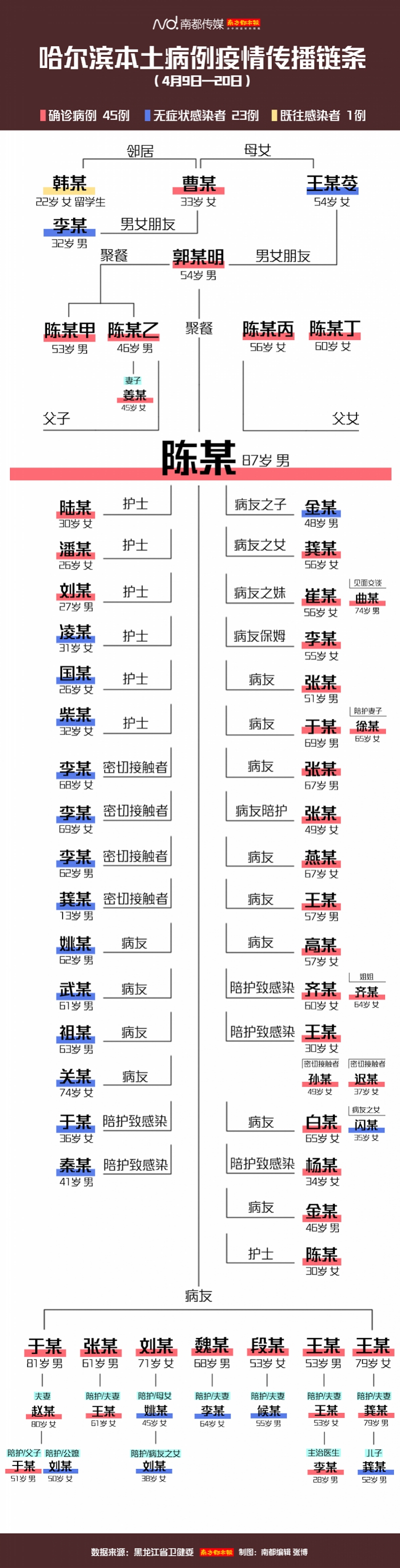 4月21日,全国新增本土确诊病例7例,均来自哈尔滨市。 哈尔滨这一波从4月9日延续至今的本土传播疫情,截至4月21日24时,已有75个感染者(52例确诊病例、23例无症状感染者),均为关联病例。再加上两例跨省的相关联的确诊病例(辽宁抚顺1例和内蒙古鄂温克旗1例),相关联病例已达77例。 梳理此次疫情哈尔滨感染者关系图,一名从美国返回的22岁女留学生韩某,被怀疑为引发疫情的源头。据哈尔滨市疾病控制中心负责韩某流动轨迹调查人员李玺琨介绍,韩某4月5日-8日曾到上海做手术。 上海市卫健委通报,韩某在上海一美容院接受手术,术后回酒店休息。在沪期间,除美容院和酒店外,韩未到过其他地方。韩某返回哈尔滨后,在4月10日至4月15日期间,已接受4次核酸检测,结果均为阴性。 哈尔滨疾控中心曾表示,目前,由于对新冠病毒认识还不够深入、对传播规律把握得还不够准确,所以对韩某和曹某之间传染的调查工作还在继续。 也就是说,传染源头的确证,尚待进一步调查。 韩某曾去上海做美容手术,在沪期间只去了美容院和酒店 据哈尔滨市疾病控制中心李玺琨介绍,韩某,女,22岁,是美国纽约大学研究生二年级学生,3月18日经美国纽约经香港、北京、中转至哈尔滨;3月19日下午18时落地哈尔滨太平国际机场,公安包括相关人员对她进行了检测和登记,以社区用手递手的方式送她到家中,就是道里区富丽江湾小区进行居家隔离,居家隔离期间没有外出。 3月31日社区带至道里区人民医院进行核酸和抗体的检测,结果是4月3日反馈为阴性,随即就解除了居家隔离。 韩某4月3日、4月4日,有跟家人外出的聚餐史。 4月5日,由父亲开车送至太平国际机场到上海做了一个手术,在上海待了3天,4月5日到8日住了3宿,4月8日返回哈尔滨,回到了父母家居住,跟她的父母还有弟弟在一起居住,直至4月10日。 上海市卫健委通报,4月6日,韩某在上海一美容院接受手术,术后回酒店休息。4月7日,赴美容院检查治疗后,回酒店休息。4月8日上午乘飞机返回哈尔滨。在沪期间,除美容院和酒店外,韩某未到过其他地方。 韩某4月10日至4月15日期间,4次核酸检测均为阴性 那么韩某是如何成为了传播源头? 哈尔滨市疾病控制中心李玺琨介绍,4月9日我们有一个病例,就是曹某,当时是无症状感染者,后来4月14日病症为确诊病例。对她的密切接触者进行筛查的时候,韩某作为密接人员进入了我们的视线,而且有国外的尤其是美国、纽约这样的高疫区的旅居史,随即我们对韩某进行了一个核酸和抗体的检测,这个是在4月10日又进行了一次,结果是核酸阴性,IGG阳性,IGM阴性。随即我们下午就进行了再次深入的流调,4月10号的下午,随即我们又采了一次样,4月11日反馈的结果,依旧是核酸阴性,IGG阳性,IGM阴性,随即对她及其家人进行了集中隔离,现在依旧在宾馆进行集中隔离。 上海市卫健委通报称,据黑龙江省卫健委反馈,韩某与哈尔滨聚集性疫情的指示病例曹某为同一幢楼邻居。经调查,未找到明确的直接接触史证据。韩某返回哈尔滨后,在4月10日至4月15日期间,已接受4次核酸检测,结果均为阴性。 目前,韩某和家人在宾馆进行集中隔离,其家人尚未被官方公布出有被感染的相关信息。 据此前报道,哈尔滨疾控中心调查认为,曹某和韩某所共同居住的单元为一梯一户,整个单元共用一部电梯,存在可能被污染的共用空间;上下相邻两层间由于房屋结构等原因,也存在病毒传播的可能,二人间具备传染的条件。 哈尔滨疾控中心表示,目前,由于对新冠病毒认识还不够深入、对传播规律把握得还不够准确,所以对韩某和曹某之间传染的调查工作还在继续。 哈尔滨本土疫情关联病例已达77例 之后,这一波本土疫情的传播链条较为清晰:曹某传染给3个亲友,分别是男友李某、自己的母亲王某苓、王某苓的男友郭某明。 郭某明与王某苓同陈某君一家聚餐,87岁的陈某君及两个儿子参与聚餐,被传染确诊,两个女儿及二儿媳也相继被感染。陈某君因脑卒中先后在哈尔滨市第二医院和哈医大一院就医,致使两院同病区多名患者、陪护人员及7名护士1名医生被感染。至今,疫情还在蔓延中。 4月21日,全国新增本土确诊病例7例,均来自哈尔滨市。其中:有4例是确诊病例陈某君(男,87岁)在哈医大一院住院期间同楼层同病区的住院患者、有3例为同期间住院患者陪护,这7例确诊病例都是已纳入集中医学观察的密接者。 截至4月21日24时,哈尔滨已有75个感染者(52例确诊病例、23例无症状感染者)与这一波从美国返回哈尔滨的22岁女留学生韩某引发的本土疫情传播有关。 哈尔滨这一波疫情还出现了两例跨省病例,分别是辽宁抚顺的确诊病例张某华(女,46岁)和内蒙古鄂温克旗确诊病例韦某某。 张某华曾去哈尔滨看望父亲,并陪护父亲在哈医大一院呼吸一科9病室住院治疗。4月12日张某华驾车由哈尔滨返回抚顺,16日被诊断为确诊病例。 韦某某4月1日-4月10日在哈医大一院住院,收治在呼吸内科9号病房1号床。4月10日返回呼伦贝尔市,11日凌晨回到鄂温克家中。4月16日23:25被接入鄂温克旗人民医院发热病房隔离留观,19日晚被诊断为确诊病例。 算上这两单跨省病例,哈尔滨这一波疫情的关联感染者已达77个。 备注:1、截至4月20日24时哈尔滨本土疫情传播链条,共计68例(确诊患者45例,无症状感染者23例)2、4月21日哈尔滨新增7例本土确诊病例,因行动轨迹尚未公布,暂不纳入图中。3、两