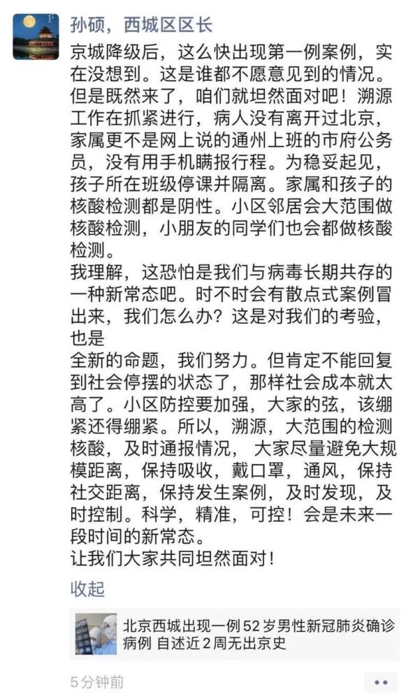 北京市政府新闻发布会6月11日通报了西城区的一起新冠肺炎确诊病例。该病例唐某某,男,52岁,北京市人,家住西城区月坛街道西便门东大街。 西城区通报了病例的发现、处置和下一步的流行病学调查等工作开展情况。同时,对于该病例的密切接触者中涉及育民小学学生一事,育民小学也于6月12日通报相关情况。 据育民小学通报,该确诊病例唐某某,其孩子系育民小学四年级学生。目前,学校已经安排唐某某孩子所在班级其他33名学生以及与该班有过接触的15名教职员工全部居家观察。班主任对学生进行心理安抚,教师开展线上教学,确保学生正常学习。 时隔50多天后,北京再次出现新冠肺炎确诊病例,引发了网友和市民的关注。 从昨日到今日,一些传言也在网上传播。有的说该病例去过吉林,旅行过程使用两部手机的健康码。还有传言说,该病例是在通州上班的北京市政府公务员。 对于网上的传言以及对该病例出现、处置的情况,知道君从有关渠道获悉,西城区区长孙硕于昨日晚在其朋友圈发布了一则信息,澄清有关传言,也表达了对该病例出现、处置情况的意见。 孙硕转发了一则关于北京西城出现新冠肺炎确诊病例的链接,并在朋友圈说: 京城降级后,这么快出现第一例案例,实在没想到。这是谁都不愿意见到的情况。但是既然来了,咱们就坦然面对吧!溯源工作在抓紧进行,病人没有离开过北京,家属更不是网上说的通州上班的市府公务员,没有用手机瞒报行程。为稳妥起见,孩子所在班级停课并隔离。家属和孩子的核酸检测都是阴性。小区邻居会大范围做核酸检测,小朋友的同学们也会都做核酸检测。 我理解,这恐怕是我们与病毒长期共存的一种新常态吧。时不时会散点式案例冒出来,我们怎么办?这是对我们的考验,也是全新的命题,我们努力。但肯定不能回复到社会停摆的状态了,那样社会成本就太高了。小区防控要加强,大家的弦,该绷紧的还得绷紧。所以,溯源,大范围的检测核酸,及时通报情况,大家尽量避免大规模聚集,保持洗手,戴口罩,通风,保持社交距离,保持发生案例,及时发现,及时控制。科学,精准,可控!会是未来一段时间的新常态。 让我们共同坦然面对! 知道君探访育民小学 知道君今日(6月12日)从北京市育民小学家长处获悉,昨日北京新增的新冠肺炎确诊者唐某某,其孩子是该校四年级学生。区教委和学校启动了应急处置预案,安排唐某某孩子所在班级其他33名学生以及与该班有过接触的15名教职员工全部居家观察。 北京市育民小学也向该校家长发布了相关工作情况说明。全文如下: 2020年6月11日唐某某确诊为新冠肺炎,其孩子系我校四年级学生。区教委和我校立即启动应急处置预案,安排唐某某孩子所在班级其他33名学生以及与该班有过接触的15名教职员工全部居家观察。班主任对学生进行心理安抚,教师开展线上教学,确保学生正常学习。 学校立即将与唐某某孩子所在班级同楼层的两个班学生转移到备用教室。同时,对教室、卫生间等公共区域和转移路线所涉及区域进行全面消毒。 6月11日上午,对唐某某孩子进行核酸以及血清学抗体检测,结果均为阴性。截至目前,孩子体温正常,身体无其他不适。 对于网传育民小学已经停课一事。今日(6月12日)上午,知道君到育民小学探访发现,学校教学仍正常进行。 今天上午刚把孩子送进学校的一位家长告诉记者,昨天班级群发出通知称,四年级一位同学是密切接触者。“这个班暂时停课了,其他年级学生可以自愿请假。” 据了解,西城区教委和学校启动了应急处置预案,安排唐某某孩子所在班级其他33名学生以及与该班有过接触的15名教职员工全部居家观察。6月11日上午,对唐某某孩子进行核酸以及血清学抗体检测,结果均为阴性。 西城病例具体情况 据北京市西城区副区长缪剑虹昨日通报,西城区报告1例新冠肺炎病例:唐某某,男,52岁,北京市人,家住西城区月坛街道西便门东大街,于6月10日下午因间断发热到辖区医院发热门诊就诊。患者曾出现畏寒,乏力等症状,但无咳嗽、无咽痛、无胸闷,患者自述近2周无出京史、无外来人员密切接触史,样本核酸检测为阳性,经专家诊断为新冠肺炎确诊病例。患者就医全程佩戴口罩,独自骑车到医院检查并隔离治疗。 目前,患者已转至地坛医院,并已对其家庭中的2名密切接触者进行集中医学观察。现西城区正在对患者进行严密的流行病学调查,进一步追根溯源,随调随控随检,应检尽检,做好密接人员管理,切断传播途径。加大社区管控力度,对其所在小区进行封闭式管理,恢复测温等措施,对其活动场所进行追踪、监测采样和消毒。 下一步,西城区将继续做好流行病学调查与社区管控等工作,加强对重点场所、重点人员的健康监测和环境采样;持续做好社区管控,加强对周边公共场所的管理;发挥医院发热门诊、社区卫生服务中心的哨点监测作用,提高预警监测能力;做好居民的健康随访、健康宣教和防护知识提示。有后续情况,将及时向社会公布。 北京市疾控处置情况 北京市疾病预防控制中心副主任庞星火通报有关工作开展情况。 6月11日凌晨2时,市疾控中心接到西城区病例标本,立刻对标本进行复核,并与西城区疾控中心第一时间赶赴现场开展流行病学调查。7时许,中心检测该病例送检样本核酸阳性。针对病例溯源,追踪密切接触者,开展环境采样及消毒等控制措施主要包