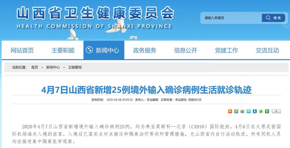 新增20例境外输入病例有关情况 病例1: 陈某,男,22岁,中国籍,常住广东省汕头市朝南区陈店镇港后村。 4月3日,乘坐SU1700航班从莫斯科前往符拉迪沃斯托克。 4月4日,乘汽车从符拉迪沃斯托克前往绥芬河口岸界碑处入境,后乘坐绥芬河大巴车至口岸联检大厅。当天转运至绥芬河市体育馆隔离。 4月5日,患者新冠病毒核酸检测阳性,遂将患者送往绥芬河市人民医院进行隔离治疗。肺CT显示病毒性肺炎可能性大,无基础性疾病。 4月6日,经专家会诊,诊断为新冠肺炎确诊病例。 该患者所有同乘回国人员均按照有关规定集中隔离观察。无中国境内密切接触者。 病例2: 陈某,男,31岁,中国籍,常住黑龙江省绥化市庆安县庆新社区国东世纪小区。 4月3日,乘坐SU1700航班从莫斯科前往符拉迪沃斯托克。 4月4日,乘汽车从符拉迪沃斯托克前往绥芬河口岸界碑处入境,后乘坐绥芬河大巴车至口岸联检大厅。当天转运至体育馆集中隔离。 4月5日,患者新冠病毒核酸检测阳性,遂将患者送往绥芬河市人民医院进行隔离治疗。肺CT显示病毒性肺炎可能性大,无基础性疾病。 4月6日,经专家会诊,诊断为新冠肺炎确诊病例。 该患者所有同乘回国人员均按照有关规定集中隔离观察。无中国境内密切接触者。 病例3: 侯某,女,32岁,中国籍,常住吉林省舒兰市文化御苑。 4月3日,乘坐SU1700航班从莫斯科前往符拉迪沃斯托克。 4月4日,乘AB760汽车从符拉迪沃斯托克前往绥芬河口岸界碑处入境,后乘坐绥芬河大巴车至口岸联检大厅。当天转运至绥芬河市世贸酒店隔离。 4月5日,患者新冠病毒核酸检测阳性,遂将患者送往绥芬河市人民医院进行隔离治疗。肺CT显示病毒性肺炎可能性大,无基础性疾病。 4月6日,经专家会诊,诊断为新冠肺炎确诊病例。 该患者所有同乘回国人员均按照有关规定集中隔离观察。无中国境内密切接触者。 病例4: 蒋某,男,32岁,中国籍,常住浙江省义乌市苏溪镇花厅村。 4月3日,乘坐SU1700航班从莫斯科前往符拉迪沃斯托克。 4月4日,乘AB902汽车从符拉迪沃斯托克前往绥芬河口岸界碑处入境,后乘坐绥芬河大巴车至口岸联检大厅。当天转运至绥芬河市体育馆隔离。 4月5日,患者新冠病毒核酸检测阳性,遂将患者送往绥芬河市人民医院进行隔离治疗。肺CT显示病毒性肺炎可能性大,无基础性疾病。 4月6日,经专家会诊,诊断为新冠肺炎确诊病例。 该患者所有同乘回国人员均按照有关规定集中隔离观察。无中国境内密切接触者。 病例5: 金某,女,55岁,中国籍,常住吉林省舒兰市三道街民康家园。 4月3日,乘坐SU1700航班从莫斯科前往符拉迪沃斯托克。 4月4日,乘汽车从符拉迪沃斯托克前往绥芬河口岸界碑处入境,后乘坐绥芬河大巴车至口岸联检大厅。当天转运至绥芬河市中医院隔离。 4月5日,患者新冠病毒核酸检测阳性,遂将患者送往绥芬河市人民医院进行隔离治疗。肺CT显示病毒性肺炎可能性大,无基础性疾病。 4月6日,经专家会诊,诊断为新冠肺炎确诊病例。 该患者所有同乘回国人员均按照有关规定集中隔离观察。无中国境内密切接触者。 病例6: 李某,男,37岁,中国籍,常住广东省汕头市潮南区红场镇仙田市溪畔1巷 。 4月3日,乘坐SU1700航班从莫斯科前往符拉迪沃斯托克。 4月4日,乘汽车从符拉迪沃斯托克前往绥芬河口岸界碑处入境,后乘坐绥芬河大巴车至口岸联检大厅。当天转运至体育馆集中隔离。 4月5日,患者新冠病毒核酸检测阳性,遂将患者送往绥芬河市人民医院进行隔离治疗。肺CT显示病毒性肺炎可能性大,无基础性疾病。 4月6日,经专家会诊,诊断为新冠肺炎确诊病例。 该患者所有同乘回国人员均按照有关规定集中隔离观察。无中国境内密切接触者。 病例7: 梁某,女,29岁,中国籍,常住广西省岑溪市乌峡小区。 4月3日,乘坐SU1700航班从莫斯科前往符拉迪沃斯托克。 4月4日,乘AB760汽车从符拉迪沃斯托克前往绥芬河口岸界碑处入境,后乘坐绥芬河大巴车至口岸联检大厅。当天转运至绥芬河市人民医院中隔离。 4月5日,患者新冠病毒核酸检测阳性。肺CT显示病毒性肺炎可能性大,无基础性疾病。 4月6日,经专家会诊,诊断为新冠肺炎确诊病例。 该患者所有同乘回国人员均按照有关规定集中隔离观察。无中国境内密切接触者。 病例8: 刘某,男,31岁,中国籍,常住绥芬河市天佑国际。 4月3日,乘坐SU1700航班从莫斯科前往符拉迪沃斯托克。 4月4日,乘AB232汽车从符拉迪沃斯托克前往绥芬河口岸界碑处入境,后乘坐绥芬河大巴车至口岸联检大厅。当天转运至绥芬河市中医院集中隔离。 4月5日,患者新冠病毒核酸检测阳性。肺CT显示病毒性肺炎可能性大,无基础性疾病。 4月6日,经专家会诊,诊断为新冠肺炎确诊病例。 该患者所有同乘回国人员均按照有关规定集中隔离观察。无中国境内密切接触者。 病例9: 马某,女,50岁,中国籍,常住广东省汕头市朝南区陈店镇溪北新工业区西环路宜达楼。 4月3日,乘坐SU1700航班从莫斯科前往符拉迪沃斯托克。 4月4日,乘AB760汽车从符拉迪沃斯托克前往绥芬河口岸界碑处入境,后乘坐绥芬河大巴车至口岸联检大厅。当天转运至绥芬河市世贸酒店隔离。 4月5日,患者新冠病毒核酸检测阳性,遂将患者送往绥芬河市人民医院进行隔离治疗。肺CT显示病毒性肺炎可能性大,无基础性疾病。 4月6日,经专家会诊,诊断为新冠肺炎确诊病例。 该患者所有同乘回国人员均按照有关规定集中隔离观