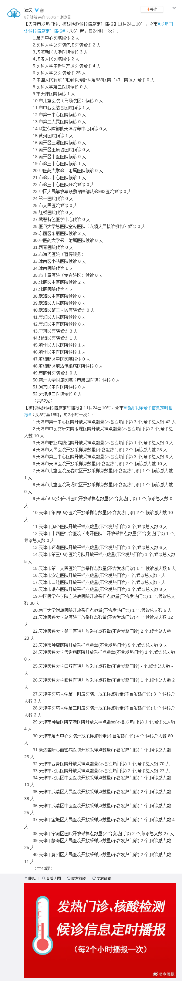 天津市发热门诊、核酸检测候诊信息定时播报
