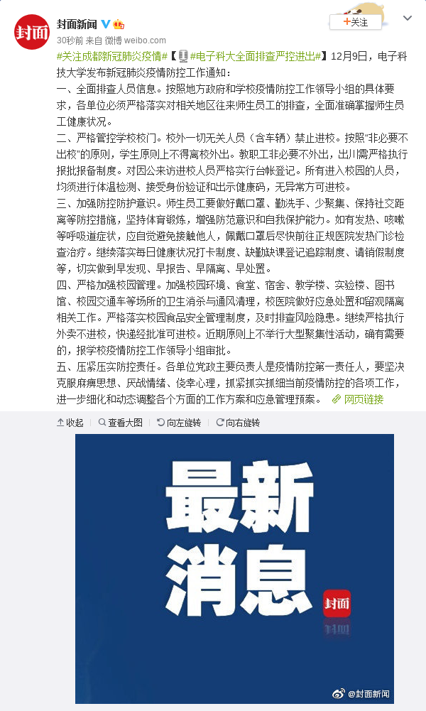 原标题:成都:开展疫情防控十项基础工作“大体检” 12月9日,省委常委、成都市委书记范锐平主持召开专题会议,传达学习省委书记彭清华来蓉调研指导疫情防控工作指示精神,研究部署加强基础防控、实施全域“体检”。会议强调,要深入学习贯彻习近平总书记关于疫情防控重要指示批示精神,全面落实党中央和省委部署要求,以对人民生命健康和城市安全高度负责的政治担当,集中人力物力,对全市疫情防控十项基础工作开展一次“大体检”,查漏补缺、集中攻坚,健全完善基础扎实、精准严密的防控体系,坚决打赢疫情防控阻击战,迅速恢复城市生机活力,奋力夺取“双胜利”。 会议强调,隔离酒店是常态化疫情防控的“隔离带”和“防护带”,一旦出现管理漏洞,容易成为风险隐患。要严格落实分工分级责任,全面深入开展隔离酒店自查整改,协调解决问题短板。要科学合理选址,加强内外规范专业管理,加强专业培训和力量配备,规范处置生活垃圾和医疗废物,全面彻底开展终末消毒,定期开展人员和环境检测,确保“零风险”“无事故”。 会议强调,医院是第一时间发现疫情的哨所,是疫情防控的主要堡垒。要全面加强医疗机构和个体诊所防控,加强院感防控,督促落实预检分诊、发热门诊、病区管理、医废处置等各项院感防控制度,严格执行发热病人闭环管理要求,对接诊病人第一时间进行核酸检测。要建立辖区内个体诊所、药店与医院发热门诊对口关系,实行发热患者和呼吸道症状患者零报告和日报告制度,确保发热患者及时规范转诊。 会议指出,冷链食品是疫情传播的重要途径。要严格监管冷链食品风险,尽快研究制定进口冷链食品管理防控措施。要关口前移,切实在口岸入关及运输环节做好核酸检测、全面消毒和监督检查。要全面排查冷库备案,加强联合执法,对非法走私、来源不明的进口冷链食品,坚决依法严格查处 会议指出,要加强交通口岸防控管理。要严格实施远端防控措施,从严落实入境人员核酸检测、健康监测,加强口岸入境、接送转运、隔离观察闭环管理。要落实地铁、公交等密闭交通工具通风、消毒、体温监测措施,严格要求同乘人员做好个人防护。要加强机场、火车站、公交站等重要交通场站的风险提示和现场疏导,增设体温测量设备。 会议指出,要落实好特殊重点机构防控措施。要督促学校和托幼机构落实教职员工、幼儿健康情况“日报告”“零报告”制度,进一步规范养老机构、福利机构、精神卫生医疗机构以及监管场所人员进出管理,加强宗教场所有序开放后的常态化防控管理。 会议指出,要压紧机关企事业单位防控责任。要加强出入管制、体温检测和外来人员接待场所管理,强化公共区域环境保洁,督促工作人员如实报告接触史、旅居史。要加强员工健康培训,优化工位分布、车间分布、工作方式。要按防控要求规范使用中央空调、新风系统,增加办公室、电梯、食堂、卫生间等公共场所消杀频次。 会议强调,社区防控始终是疫情防控最基层最基础的工作。要深挖细查堵塞漏洞,持续做好社区防控工作。要严格执行小区院落防控措施,持续做好出入佩戴口罩、体温检测、亮码通行和公共区域环境消杀等工作,强化联防联控,加强出租房、集体宿舍和外来人员等群体排查管控。要组织开展爱国卫生疫情防控专项行动,持续强化防疫知识宣传普及,提高居民个人防护和健康监测能力。 会议强调,要持续加强文化旅游消费娱乐场所防控。要全覆盖检查密闭式休闲娱乐场和室内场馆防控措施落实情况,实施身份证、健康码登记管理,全面落实消毒通风、体温监测、佩戴口罩等防控措施。要加强景区景点防控,加强对酒店民宿、餐饮饭店防控工作督查指导力度,健全中高风险地区来人和呼吸道发热旅客的预警报告制度。 会议强调,疫情防控既是排查处置攻坚战,也是防控物资保障战。要加强防控物资储备管理,全面提升公共卫生应急物资保障能力。要加强储备能力建设,进一步完善应急物资储备品种、规模、结构,做好相关药品、医疗防护物资等防控物资储备。要利用大数据、物联网等先进技术,提高储备物资的科学组织调拨能力,确保重要应急物资关键时刻调得出、用得上。 会议指出,要加强预警监测和信息发布。要严格落实疫情报告制度,做好重点场所、重点环节、重点人群监测工作,确保主动发现疫情、及时果断处置。要及时发布疫情最新情况和防控举措,做好解疑释惑工作,对造谣滋事者要依法查处。 来源:川观新闻