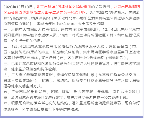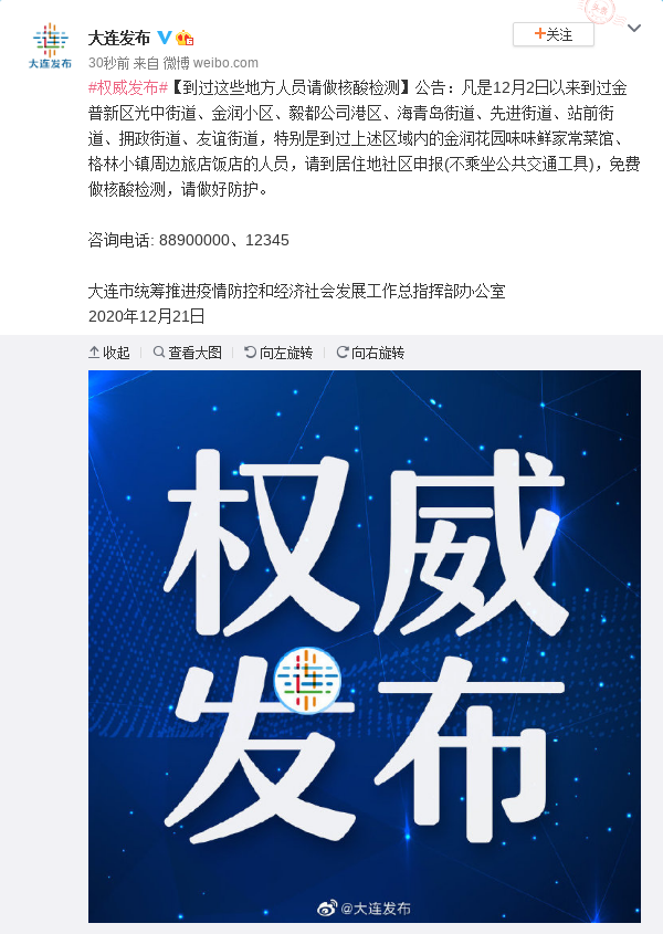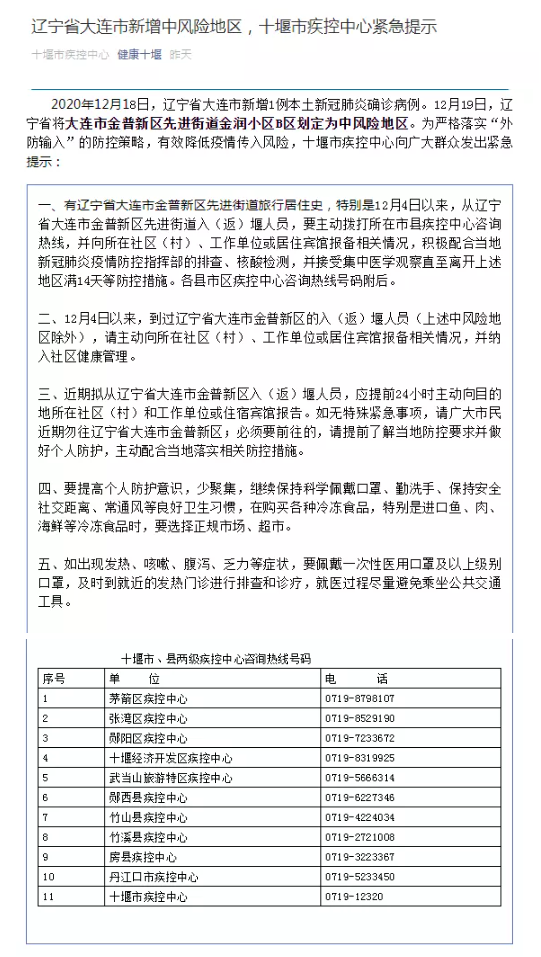 原标题:东北一地连发紧急通知:医院停诊、培训机构停课! 来源:新晚报 12月19日0时至24时 大连市新增1例确诊病例 现将其轨迹公布如下 病例张某,男,39岁,味味鲜家常菜馆经营者兼厨师,地址:金普新区金润小区B区。在集中隔离期间核酸检测阳性。已转入省新冠肺炎集中救治大连中心隔离治疗,经临床诊断为确诊病例(普通型)。 12月12日至17日期间,在自家餐馆后厨工作,偶尔在收银台帮忙。 12月12日,晚17时左右,无症状感染者张某和同事到其菜馆吃饭。 12月14日,9时步行前往金润小区A区君谊康健按摩店按摩,10时步行前往餐馆工作。 12月16日,6时30分自驾前往金普新区金发地大市场购买牛肉,7时到达市场,步行进入肉类售卖区,7点30分离开,9时步行前往君谊康健按摩店按摩,10时步行前往餐馆工作。 12月13日、15日、17日,除在餐馆工作外,无其他特殊行程。 12月18日,转运至集中隔离酒店。 大连市统筹推进新冠肺炎疫情防控和 经济社会发展工作总指挥部 2020年12月20日 鉴于大连金普新区出现确诊病例 该区培训机构停课!医院停诊! 紧急通知 各培训学校: 鉴于目前新区疫情情况,为保障师生健康安全,现要求各培训机构立刻停止一切线下培训活动,安排教师和学生安全撤离校区。叮嘱教师、学生及所有工作人员要积极配合各街道和社区做好核酸检测,尽快完成此次排查工作。复课时间待接到上级明确指示后另行通知。 金普新区教育和文化旅游局 2020年12月19日 大连医科大学附属第一医院 重要通知 敬告广大患者朋友: 根据目前大连市金普新区的疫情预警,按照大连市卫健委要求,为全力做好新冠肺炎防控工作,有效应对突发疫情,降低社会传播风险,更好地提供防治和诊疗服务,大医一院已从各个环节加强预防、监控工作。