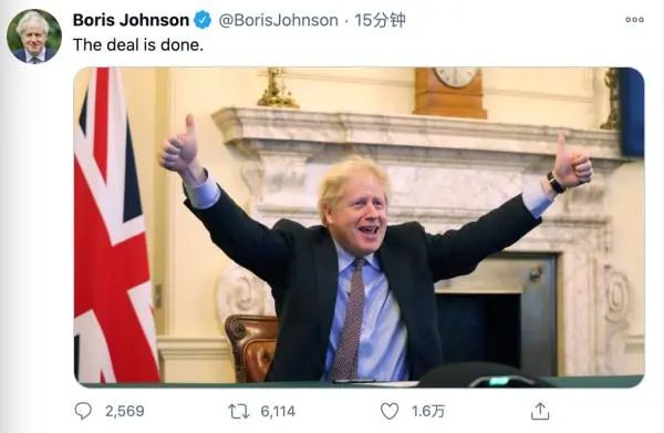 “脱欧”贸易协议达成 约翰逊开心竖起大拇指