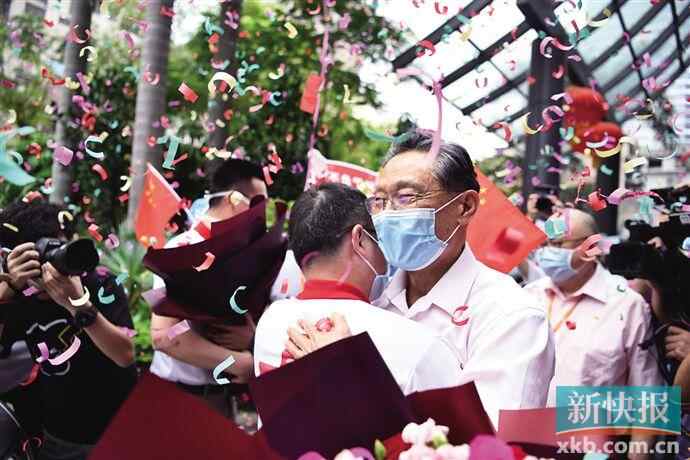 新快报讯 记者高镛舒报道 礼炮、鲜花、拥抱、笑声……欢迎回家!5月11日,广州医科大学附属第一医院外派前往伊拉克支援50天的两位医疗专家,该院ICU副主任医师徐永昊、放射科主任医师陈淮结束休整,回到医院,该院院领导、医护同事们手捧鲜花标语,迎接战士归队。