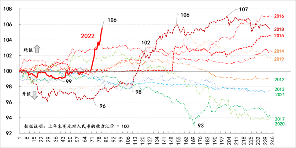 1.汇率贬值虽可能有助于出口商获得价格优势,但同时也削弱了进口商的购买力,因此快速变奏究竟是改善贸易条件,还是恶化贸易条件,需评估后兼顾好,不然就会出现赔本赚吆喝。 2.理论上汇率贬值能够带来金融条件的放松,而当前经济下行确实也需要货币金融条件的放松,但是此举是有条件的,即市场预期不能过度发散。迄今,运用汇率贬值来放松货币金融条件,中国为数不多的实操,一次是1994年汇率并轨,人民币汇率一夜之间贬值33.3%至8.6783,还有一次就是2015年的“8.11”汇改,三天内汇率贬值了3%。但是这两次操作都有其特殊背景,而且事后看政策成本并不低。因此,是否将汇率贬值视作逆周期调节工具需要仔细评估,更何况“以邻为壑”的汇率政策很容易受到别国的诟病,进而影响人民币成为国际货币的进程。 3.按照“不可能三角理论”,货币当局无法同时实现利率政策独立、汇率稳定和资本自由流动,当前虽然多数经济体已经进入加息潮,但经济下行迫使我们的利率政策更多要以我为主,而促进金融高水平双向开放则需要稳定外资政策态度的坚持,由此资本自由流动就需要保证,所以增强汇率弹性就成为必然。而反过来说,之所以要牺牲汇率的稳定,就是因为能够实现利率政策独立性和跨境资金流入,由此,对于汇率弹性的评估实际上事关货币政策的有效性。 因此,对于本次人民币汇率的变奏,市场参与者绝不能简单地用美元上涨、经济下行等因素来理解,因为这一次政策层需要考虑的因素更为复杂,需要兼顾的方面也更多。
