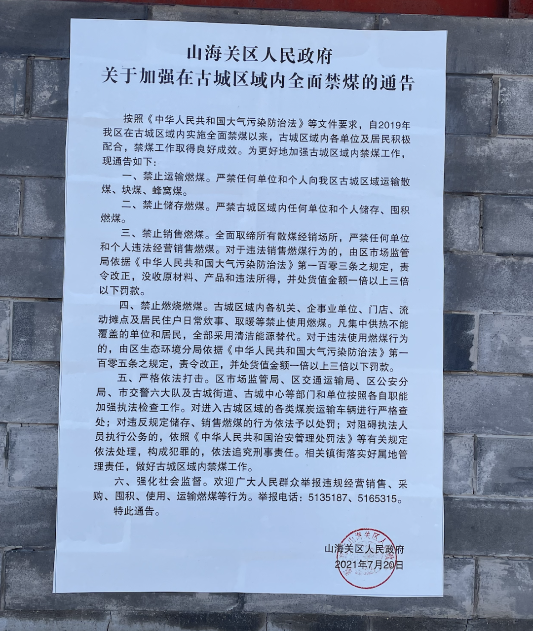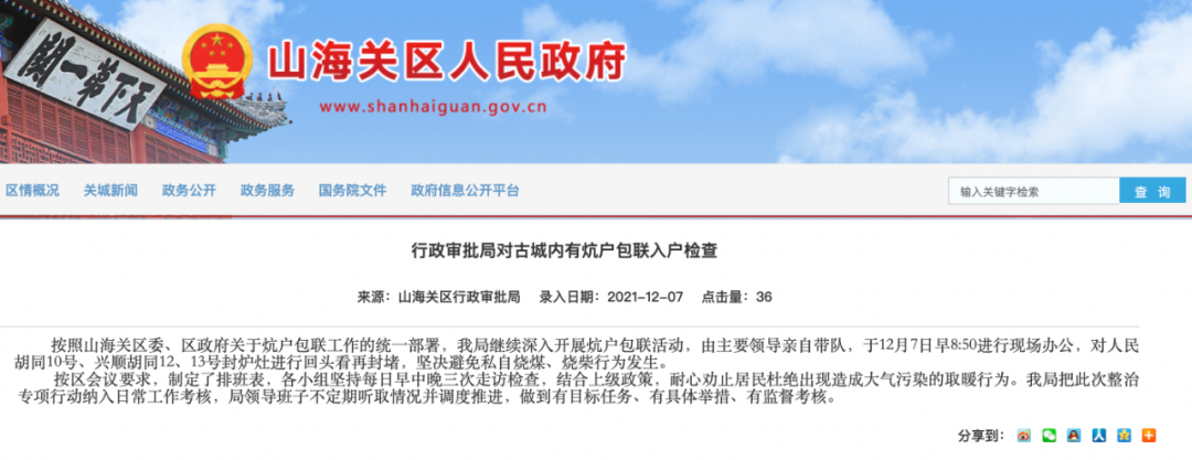 当地一位干部告诉记者,禁止烧柴取暖、封堵炉灶,相关领导干部明知这不符合政策要求,但仍然强制执行,根本原因是古城内有国家级大气监测国控点位,为了数字好看,区里只能环保管控层层加码。 知情干部还告诉记者,不仅仅是古城内,山海关古城外的其他村庄,目前可以正常烧柴,但临近古城国控监测点位的一个村庄,也不让烧柴和其他生物质,就是为了确保监测点位的环保数据达标,“就是为了想尽办法把数值降下来。现在不让老百姓烧柴,就为了12月份最后一个月的数据。每年都这样,去年也是这样,今年可能达不到环保任务,所以管控更严了。” 山海关区一位要求匿名的领导干部对记者表示,古城内国控点位的环保数据,如果不好看,确实让主要领导压力非常大。 为确保古城居民冬季取暖,当地对外宣称,制定补贴方案,推动电力改造,还建立了包联帮扶制度。其中提到,由53家区直单位对古城内544户有炕户进行包联帮扶。知情的干部告诉记者,所谓的帮扶困难户和有炕户,实为管控,严防死守,禁止烧柴取暖。“对这些人进行包联,就是劝服。这些(宣传)信息就是这么冠冕堂皇,没有实打实的内容。” 当地政府官网发布的一则宣传稿也印证了这一点。 根据山海关区政府官网12月7日发布的消息称,区行政审批局主要领导亲自带队,现场办公,对人民胡同10号、兴顺胡同12、13号封炉灶进行回头看再封堵,坚决避免私自烧煤、烧柴行为发生。