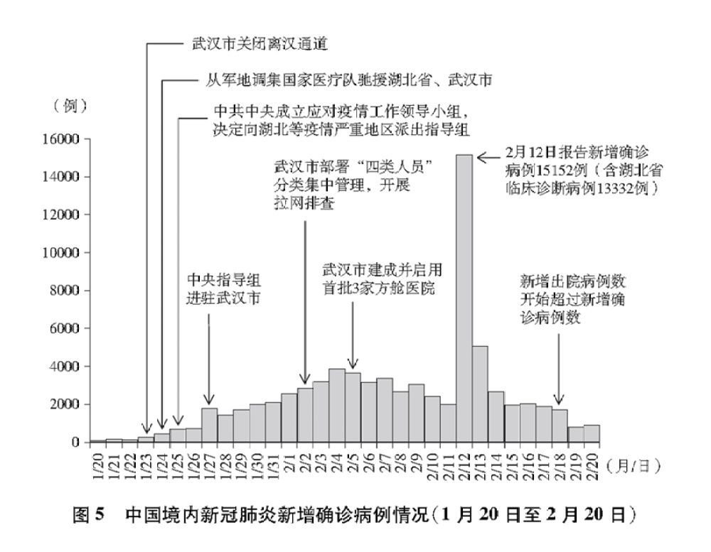 (二)第二阶段:初步遏制疫情蔓延势头 (1月20日至2月20日) 全国新增确诊病例快速增加,防控形势异常严峻。中国采取阻断病毒传播的关键一招,坚决果断关闭离汉离鄂通道,武汉保卫战、湖北保卫战全面打响。中共中央成立应对疫情工作领导小组,并向湖北等疫情严重地区派出中央指导组。国务院先后建立联防联控机制、复工复产推进工作机制。全国集中资源和力量驰援湖北省和武汉市。各地启动重大突发公共卫生事件应急响应。最全面最严格最彻底的全国疫情防控正式展开,疫情蔓延势头初步遏制。(图5) (1)1月20日,中共中央总书记、国家主席、中央军委主席习近平对新型冠状病毒感染的肺炎疫情作出重要指示,指出要把人民生命安全和身体健康放在第一位,坚决遏制疫情蔓延势头;强调要及时发布疫情信息,深化国际合作。 (2)1月20日,国务院总理李克强主持召开国务院常务会议,进一步部署疫情防控工作,并根据《中华人民共和国传染病防治法》将新冠肺炎纳入乙类传染病,采取甲类传染病管理措施。 (3)1月20日,国务院联防联控机制召开电视电话会议,部署全国疫情防控工作。 (4)1月20日,国家卫生健康委组织召开记者会,高级别专家组通报新冠病毒已出现人传人现象。 (5)1月20日,国家卫生健康委发布公告,将新冠肺炎纳入传染病防治法规定的乙类传染病并采取甲类传染病的防控措施;将新冠肺炎纳入《中华人民共和国国境卫生检疫法》规定的检疫传染病管理。国家卫生健康委发布《新型冠状病毒感染的肺炎防控方案(第二版)》。 (6)1月22日,中共中央总书记、国家主席、中央军委主席习近平作出重要指示,要求立即对湖北省、武汉市人员流动和对外通道实行严格封闭的交通管控。 (7)1月22日,国家卫生健康委发布《新型冠状病毒感染的肺炎诊疗方案(试行第三版)》。国务院新闻办公室就疫情举行第一场新闻发布会,介绍疫情有关情况。国家卫生健康委收到美方通报,美国国内发现首例确诊病例。国家生物信息中心开发的2019新型冠状病毒信息库正式上线,发布全球新冠病毒基因组和变异分析信息。 (8)1月23日凌晨2时许,武汉市疫情防控指挥部发布1号通告,23日10时起机场、火车站离汉通道暂时关闭。交通运输部发出紧急通知,全国暂停进入武汉市道路水路客运班线发班。国家卫生健康委等6部门发布《关于严格预防通过交通工具传播新型冠状病毒感染的肺炎的通知》。1月23日至29日,全国各省份陆续启动重大突发公共卫生事件省级一级应急响应。 (9)1月23日,中国科学院武汉病毒研究所、武汉市金银潭医院、湖北省疾病预防控制中心研究团队发现新冠病毒的全基因组序列与SARS-CoV的序列一致性有79.5%。国家微生物科学数据中心和国家病原微生物资源库共同建成“新型冠状病毒国家科技资源服务系统”,发布新冠病毒第一张电子显微镜照片和毒株信息。 (10)1月24日开始,从各地和军队调集346支国家医疗队、4.26万名医务人员和965名公共卫生人员驰援湖北省和武汉市。 (11)1月25日,中共中央总书记习近平主持召开中共中央政治局常务委员会会议,明确提出“坚定信心、同舟共济、科学防治、精准施策”总要求,强调坚决打赢疫情防控阻击战;指出湖北省要把疫情防控工作作为当前头等大事,采取更严格的措施,内防扩散、外防输出;强调要按照集中患者、集中专家、集中资源、集中救治“四集中”原则,将重症病例集中到综合力量强的定点医疗机构进行救治,及时收治所有确诊病人。会议决定,中共中央成立应对疫情工作领导小组,在中央政治局常务委员会领导下开展工作;中共中央向湖北等疫情严重地区派出指导组,推动有关地方全面加强防控一线工作。 (12)1月25日,国家卫生健康委发布通用、旅游、家庭、公共场所、公共交通工具、居家观察等6个公众预防指南。 (13)1月26日,中共中央政治局常委、国务院总理、中央应对疫情工作领导小组组长李克强主持召开领导小组第一次全体会议。国务院办公厅印发通知,决定延长2020年春节假期,各地大专院校、中小学、幼儿园推迟开学。国家药监局应急审批通过4家企业4个新型冠状病毒检测产品,进一步扩大新型冠状病毒核酸检测试剂供给能力。 (14)1月27日,中共中央总书记习近平作出指示,要求中国共产党各级组织和广大党员、干部,牢记人民利益高于一切,不忘初心、牢记使命,团结带领广大人民群众坚决贯彻落实党中央决策部署,全面贯彻“坚定信心、同舟共济、科学防治、精准施策”的要求,让党旗在防控疫情斗争第一线高高飘扬。 (15)1月27日,受中共中央总书记习近平委托,中共中央政治局常委、国务院总理、中央应对疫情工作领导小组组长李克强赴武汉市考察指导疫情防控工作,代表中共中央、国务院慰问疫情防控一线的医护人员。同日,中央指导组进驻武汉市,全面加强对一线疫情防控的指导督导。 (16)1月27日,国家卫生健康委发布《新型冠状病毒感染的肺炎诊疗方案(试行第四版)》。国家卫生健康委负责人应约与美国卫生与公众服务部负责人通话,就当前新型冠状病毒感染的肺炎疫情防控工作进行交流。 (17)1月28日,国家主席习近平在北京会见世界卫生组织总干事谭德塞时指出,疫情是魔鬼,我们不能让魔鬼藏匿;指出中国政府始终本着公开、透明、负责任的态度及时向国内外发布疫情信息,积极回应各方关切,加强