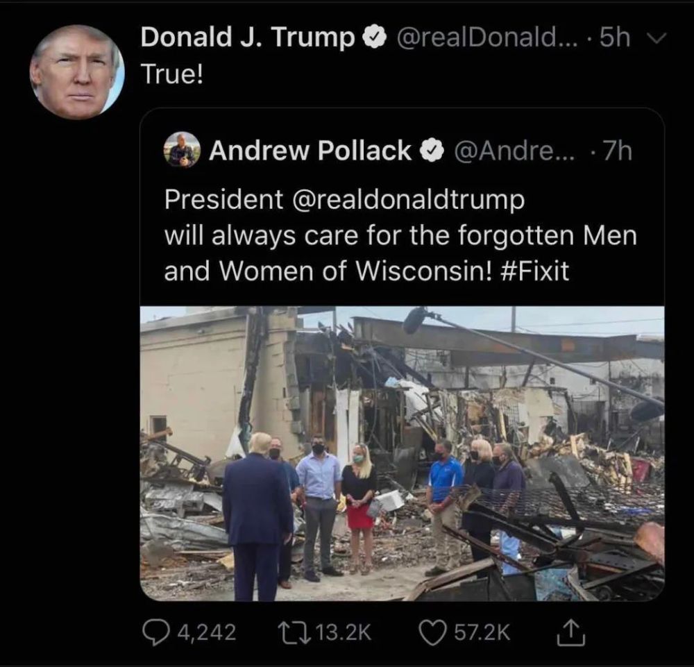 ABC报道称,部分基诺沙市民同样担忧特朗普此行可能会在抗议示威浪潮略有平息后再度点燃公众情绪,进而引发更多的暴力与破坏行为。66岁的退休市民戴维·桑切斯坦言,他觉得表示“特朗普不是来弥合分歧的,而是来制造更多麻烦的”,桑切斯预计特朗普到访当日将有数千人举行抗议。60岁的戴安娜·克雷则认为,特朗普是在利用本次冲突,他的此次访问是为大选进行铺垫,“我不喜欢这一切都被政治化。” 不过,并非所有基诺沙市民都对特朗普的到访持反对态度。41岁的奥斯卡·埃斯科巴经营着一家搬场公司,还合伙开办了酒吧和烧烤店。他直言,尽管自己对民主党和共和党都没感觉,但是他觉得朗普的到访可能有助于改善基诺沙局势,“我希望特朗普可以让我们全冷静下来,或许他可以让我们团结起来。特朗普到访证明他关心基诺沙发生的一切。” 面对官员与部分民众的反对声,特朗普似乎没有取消访问的打算。在31日的新闻发布会上,当被问及是否考虑暂缓访问计划时,特朗普直接予以否认: “不,因为我们在基诺沙的工作干得不错,我必须去看看那里为了我而表现出色的人,我们将会见无数的人。我们在威斯康星州拥有大量的支持者,所以我答应他们当一切都处置妥当后,我就会过去。” “我们周二见。” 特朗普在推特上写道。