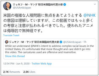 值得注意的是,这则动画也引起了美国驻日本临时代理大使约瑟夫·杨(Joseph·M·Young)的注意。他在9日用英语和日语同时发表推特称,“我们理解NHK意在聚焦美国复杂的种族问题,但遗憾的是这则动画在制作时没有充分思考,不够谨慎。使用的动画人物也有冒犯性、欠缺考量。”↓