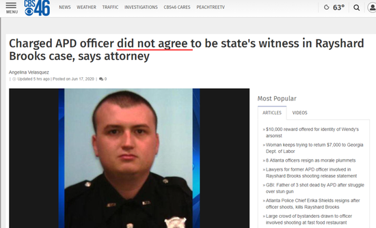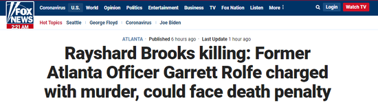 这位检察官称,布鲁克斯“从未被告知”已被逮捕。而警察枪杀布鲁克斯后的两分钟内没有提供“及时”的医疗救护。此外,当布鲁克斯倒在地上时,罗尔夫踢了他,而另一名当时现场警察德文·布鲁斯南(Devin Brosnan)则站在他的身上。 霍华德表示,布罗斯南也面临三项指控,包括犯有严重的殴打和违反宣誓誓言的行为。并说,布鲁斯南表示将作为该州的证人。 然而,代表罗尔夫的律师则在新闻发布会后对此发表声明提出异议,声称当罗尔夫试图给布鲁克斯戴上手铐时,后者拒绝逮捕并偷走枪,“选择暴力攻击两名穿制服的警察”。这名律师事务所辩解称,罗尔夫开枪的决定是合理的。 布罗斯南的律师唐·塞缪尔(Don Samuel)也反驳检察官有关布罗斯南已同意担任该州的合作证人的说法。这位律师在一封电子邮件中称,“他不是一个合作的见证人。他不同意作证。他不同意认罪。” 霍华德表示,他已经签发了逮捕令,并要求涉事警察在周四下午6点前自首。他还建议不要为罗尔夫提供任何担保,而可为布罗斯南提供5万美元的担保。 报道称,如果被判犯有谋杀罪,罗尔夫将面临死刑或终身监禁,而殴打罪的刑期为1至20年。 据了解,这是富尔顿地检署第40次对警方滥用执法权力进行起诉。 观察者网此前报道,当地时间6月12日,亚特兰大警方在执法过程中枪杀27岁非裔男子布鲁克斯。快餐店监控录像显示,他与警方发生肢体冲突后,夺过一名警察的电击枪后开始逃跑。 布鲁克斯的亲戚克丽丝托·布鲁克斯(Crystal Brooks)也在现场。她表示,“他没有伤害任何人,他的车已经停了,但是警察还是把他从车里拽出来,并和他发生了争斗。”“他抢了电击枪,但是他只是抢了电击枪然后逃跑了。” 事件发生后,亚特兰大市长博顿斯立即表态:“我不认为此案有使用致命武力的正当理由,我要求立即开除该警察。”随后,亚特兰大市警察局长谢尔茨火速宣布辞职。 而涉事的两名警察:布鲁斯南(下图左)被停职,而开枪的加勒特·罗尔夫已被解雇。