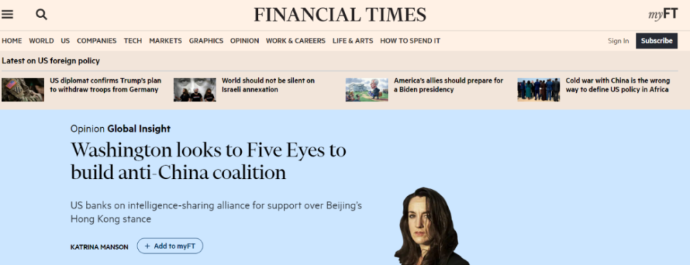 三 紧跟美国肯定有好处,但并非没有代价。这就跟《浮士德》说的一样,想要得到超过自身能力的利益,就得把灵魂卖给魔鬼。英国的代价大家都看见了,是交出霸主宝座。而加拿大、澳大利亚等国,交出的则是部分主权。 “孟晚舟事件”就是很明显的例子。 有人认为,“孟晚舟事件”是个法律问题,“双重犯罪”是加拿大司法机构“独立”做出的判断。这个说法忽略或者掩盖了一个最基本的问题——加拿大的司法机构是否有理由扣押并审判孟晚舟? 孟晚舟跟SKYCOM公司的关系,还有华为跟SKYCOM公司的关系到底如何,那都是发生在伊朗、香港的事情,加拿大和美国的司法机构为何有权管辖?美国法院可以自说自话定一个“长臂管辖”,但如果加拿大法院对美国的说法根本不认同,还谈什么“双重犯罪”的“独立”判决? 说到底,加拿大的司法体系“独立”也是在承认美国“长臂管辖”原则之下的,或者说加拿大的司法体系“独立”于加拿大政府,但是不“独立”于美国的司法体系。 5月27日,孟晚舟去加拿大法院的路上(图源:路透社) “五眼联盟”中还有一个国家在配合美国的疫情“甩锅”言论中,充当了急先锋,那就是澳大利亚。今年5月,澳大利亚《每日电讯报》声称,该媒体从“五眼联盟”获得了一份调查报告,报告显示“中国故意隐瞒新冠肺炎疫情信息”,并指责中国“破坏国际透明度”。 于是澳大利亚后来居上,成了利用疫情搞政治操作的主要推动者。澳大利亚曾努力游说法国、德国、英国等国家领导人支持所谓“病毒源头的独立调查”。 做人家小弟,澳政府的心态如何?澳洲影视人最近拍摄了一部叫《松树谷》的电视剧,描述了大国在亚太地区的博弈和美澳情报合作的微妙关系。在剧中,作为东道主的澳方情报人员受国力影响,不得不听命于美方,倍感纠结。 尽管作为“五眼联盟”的成员交出了部分国家主权,可以最大程度逃脱被美国打压的境遇,过了半个多世纪的安稳日子。但是“花无百日红”,在百年未有之大变局下,这些国家未来会啥样就不好说了。 但是,他们的发展一旦让美国稍微不爽,美国就要干涉。比如5G技术对经济的好处不言而喻,可美国硬是逼着英国不要接受华为更好的设备。 现在看来,一个患了“焦虑症”的美国,其强烈的孤立主义、保护主义倾向及零和思维正越来越深地伤害到其盟友的利益。 德国国际政治学者奥利弗·福克斯认为,“五眼”实际上就是“1只大眼+4只小眼”,美国是绝对主角,但 “4只小眼”并不愿再百分百地服从,只是目前仍无法脱离美国的掌控。 “五眼联盟”到底还能撑多久?这个问题真挺有意思的。 文/千里岩 编辑/宇文雷格
