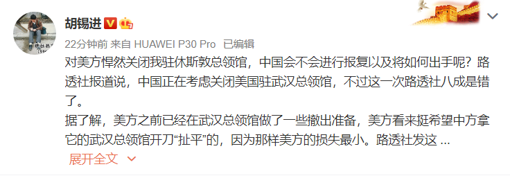 中国人民大学国际关系学院副院长、美国问题专家金灿荣认为,此事的性质就是政治对抗升级,是非常严重的事件,可以看出,美国政府内部有一些人已经铁了心要跟中国搞“新冷战”,甚至不惜发动一场战争,来把中国的气势打掉,延缓中国发展。他认为,首先,美国政府从目前出台的各种制裁措施和言行来看,对华战略敌意比外界所预料的更深。第二,可能是大选的原因,特朗普团队需要提升中美对抗的程度,转移国内视线。获得国内基本盘的支持。但无论是出于哪一个原因,结论很清楚,中美关系会继续下滑。 中国有哪些牌可以打? 在谈到中方接下来可能采取的合法合理又符合国际关系和外交公约方面的反制措施时,马呈元谈到,中方最有可能采取的行动就是相应减少一个美方驻华的总领事馆。信强表示,美方此举肯定将招致中国的反击。他认为,中国也不排除会关闭美国驻香港总领事馆。《环球时报》22日在社交网络上设置的投票显示,多数网友认为美国驻港总领馆最可能被关闭。 不过,据路透社22日消息称,中国正在考虑关闭美国驻武汉总领事馆,但该消息尚未得到官方证实。