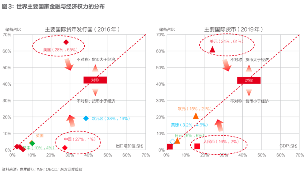 大危机:第二次霸权解体危机 美国霸权在二战结束后得以确立,至1973年前后出现转折,开始走向衰落。美国霸权的衰落也是从经济领域开始的,具体表现为制造业竞争力和GDP份额的下降。 两次石油危机可被看作美国制造业由盛而衰的转折。20世纪80年代初开始,在金融全球化的浪潮下,美国经济“脱实向虚”的倾向不断强化。虽然美国制造业总产出并未下降,但其在全球制造业和美国GDP中的份额却在收缩,分别为15%(2017年)和11%(2019年)的历史性低位。中国制造业增加值在2009年反超美国,成为全球第一制造业强国。 1979年,美国制造业就业人数达到峰值,约2000万,而后不断下降。至1989年,美国政府部门就业人数首次超过制造业就业人数,2008年,前者达到后者的两倍(目前剪刀差正在收窄)。金融行业从业人数虽然并未超过制造业,但两者的差值却在不断缩小,至2008年金融危机之前缩小至300万。制造业就业人数占比早在1953年就达到了峰值(26%),2008年仅为8.3%。 美国制造业份额的衰落与其经济发展阶段有关系,但更为重要的是受到了来自欧洲和日本(以及亚洲“四小龙”) 的竞争。即使是在钢铁和汽车产业这些曾经令美国崛起的支柱性产业,美国也没有保住其领先优势。归根到底,按照辜朝明的说法,都是因为经济已经进入到了“被追赶阶段”。 从进出口贸易总额的角度看,欧元区占比最高,1990年占比36%,目前已降至25%;20世纪90年代末,美国在全球的份额为16%,目前已经降至11.4%;中国则从加入WTO时期的不到3%升至2019年的10.5%,而且是全球最大的(单一)出口国。从GDP的角度看,二战后初期,全球生产1美元GDP,约5角是美国贡献的,截至60年代初,美国GDP占全球的比重仍然达到40%,但目前已经降至24%。相反,中国已经升至16.3%,为全球第二大经济体,分别于2010年和2018年超过日本和欧元区。 但是,与此同时,美国的金融霸权仍然是非常稳固的。美国相对经济实力衰落和金融霸权的稳固形成鲜明对比,状况类似于第一次世界大战前后的英国。英国之所以在经济被美国超越后仍能维持金融霸权,一方面是因为货币与金融的强网络外部性;另一方面,也与美国强监管的金融政策和孤立主义的外交政策相关。 在1913年《联邦储备法案》通过以前,美国金融业的经营和监管是建立在南北战争期间通过的《国民银行法》的约束之下的,它不仅禁止美国的银行在海外设立分支机构,还禁止银行跨境开设分支机构。美国的金融基础设施因此非常落后。所以,一战前,只有少数信托公司可以绕开法律的限制,开展非常有限的金融业务。除此之外,J.P.摩根可以通过私人银行或家族成员在海外的金融机构,开展部分国际银行业务。 当前,美国的金融霸权与经济实力也存在着巨大的失衡,前者远远超过后者。这与一战前的英国有相似之处。美国的金融霸权是否不可撼动,美元的国际地位是否可以高枕无忧?答案是否定的。 随着欧盟一体化进程的推进,欧元在国际货币体系中的地位至少可以上升到与其贸易规模相匹配的高度。目前,欧元在国际储备中的份额为20.5%,低于进出口贸易的25.3%。与此同时,随着中国汇率市场化和要素市场化改革进一步推进,金融开放的大门越打越开,中国的金融地位也会进一步提升。 目前,中国的综合经济(GDP、制造业和贸易份额)实力与金融地位严重失衡,人民币的国际地位显著偏低(图3)。究其原因,与一战前的美国有非常相似之处,中国基本上遵循的是由内而外的市场化次序,金融开放的步伐滞后于贸易的开放和国内经济体制改革。当然,也应该认识到,人民币国际化仍处在初级阶段,在经济实力超越美国之前,人民币国际化想取得突破性进展,难度较大。 中国经济实力的增强并不必然带来金融地位的提升,当前国际货币体系的困境主要在于其内部。早在1960年,特里芬就提出了美元在布雷顿森林体系中面临的难题,后来被称为“特里芬困境”。布雷顿森林体系是建立在美元-黄金平价基础上的,美元信用建构在黄金之上,自然也随着黄金储备的流失而下降。 从20世纪50年代中期开始,随着美国黄金储备的流失,1958年,美国以外国家的黄金储备首次超过美国;1959年,美国外债总额首次超过其黄金储备;1963年,其他国家官方持有的美国外债总额首次超过黄金储备。以上三个交叉可被称之为三个“死亡交叉”,均反映了布雷顿森林体系的脆弱性。从1963年到布雷顿森林体系崩溃,其间仅经历了不到十年时间。 在布雷顿森林体系中,虽然黄金储备被认为是美联储的资产,但从持有美元的主体来说,它对应的却是美国的或有负债,美联储负有将美元兑换成黄金的合约义务。在“布雷顿森林体系2.0”体系中,黄金的角色被美国提供的其他安全资产——如美国国债、机构MBS等——取代。本世纪初以来的实证证据表明,美元安全资产短缺已经成为一项特征事实。 2008年金融危机及后危机时代全球经济的诸多病症,如低利率或负利率,经济增长停滞,以及风险资产与无风险资产价格同步上行等,都预示着该体系负重难行,以及美国霸权难以维系。从这个角度看,2008年金融危机,以及中美贸易冲突,也可以被理解成一次霸权解体危机。