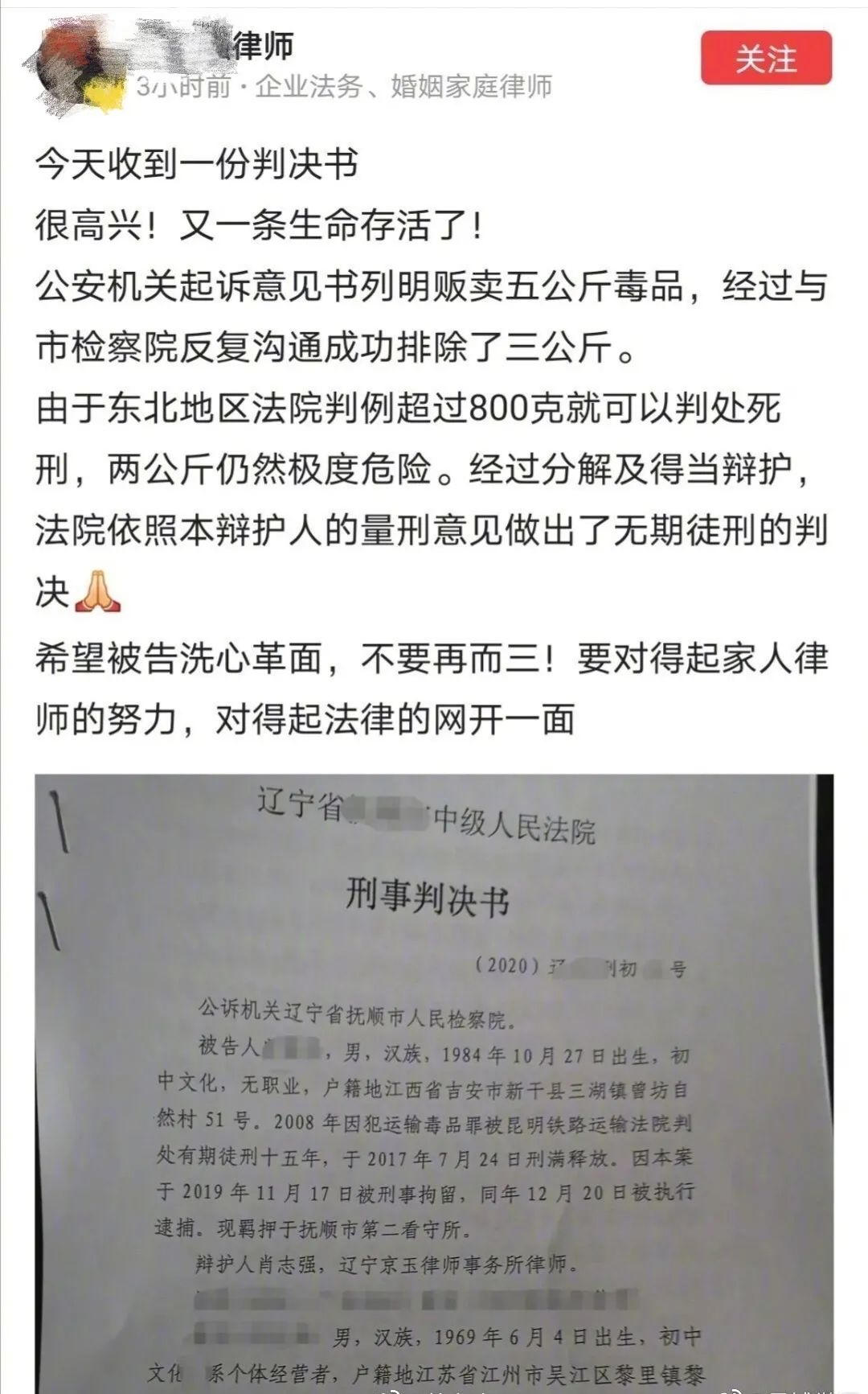 “今天收到一份判决书,很高兴,又一条生命存活了。”12月28日,辽宁一律师“庆祝挽救毒贩性命”的帖子引发巨大争议。 据媒体报道,该律师是为“二进宫”的毒贩张某做辩护。36岁的张某2008年时曾因贩毒被判处有期徒刑15年,减刑6年后,于2017年被释放,2019年他再度因涉嫌贩毒被捕。律师称,张某2019年再次落网后,检察机关起诉他涉嫌贩卖3公斤冰毒,但警方侦查过程中查获的数量为2公斤,经律师沟通,检方公诉时采纳了律师意见,认定贩毒数量为2公斤。最终张某被依法判处无期徒刑。 都说“救人性命,功德无量”,可在该案中,涉事律师“救”人一命的做法与发帖“庆祝”的举动,却遭到无数人的非议。究其原因就在于,他“救”的是毒贩的命。 问题来了:该律师先是为毒贩争取从轻量刑,后是发帖“庆祝”挽救了毒贩性命,到底合不合适?这无疑需要置于“情理法”的框架下去审视和评判。 从法律角度讲,他为毒贩争取利益,本无可厚非,这连着的仍是“律师该不该为‘坏人’辩护”的老话题。 我国《刑事诉讼法》明确了,被告人获得辩护的权利受法律保障。第三十七条还规定,辩护律师的责任是根据事实和法律提出被告人无罪、罪轻或者减轻、免除其刑事责任的材料和意见,维护被告人的诉讼权利和其他合法权益。今年10月,有辩护律师称毒贩委托人是“宵小之辈”“邪恶之徒”,在辩护意见中说“只能以刑罚诛其恶行恶念”,引发法律圈的异议,原因亦在于此。 说到底,律师受人之托为人争取利益,是职责所在——无论委托人是“好”是“坏”。正如有法律人士所说的,律师不是为“坏人”的“坏”辩护,而是为“坏人”的“人”辩护。“坏人”作为自然人的法律权利得到了维护,好人的权利就更有保障了。涉事律师依托专业知识“救”了毒贩一命,虽非很多人喜闻乐见的情况,但也不必以泛道德化视角去看待,而应让法律的归法律。 但就情理维度看,该律师“庆祝挽救毒贩性命”,确实没顾虑到很多人对贩毒等犯罪行为的敏感情绪。当律师的高调“庆祝”跟网友们的“敏感”在舆论场短兵相接,难免让许多网民觉得不适或不满。 作为辩护律师,为当事人顺利争取到了利益,“高兴”在所难免。但他的“高兴”,对应的是很多网民的“不高兴”。